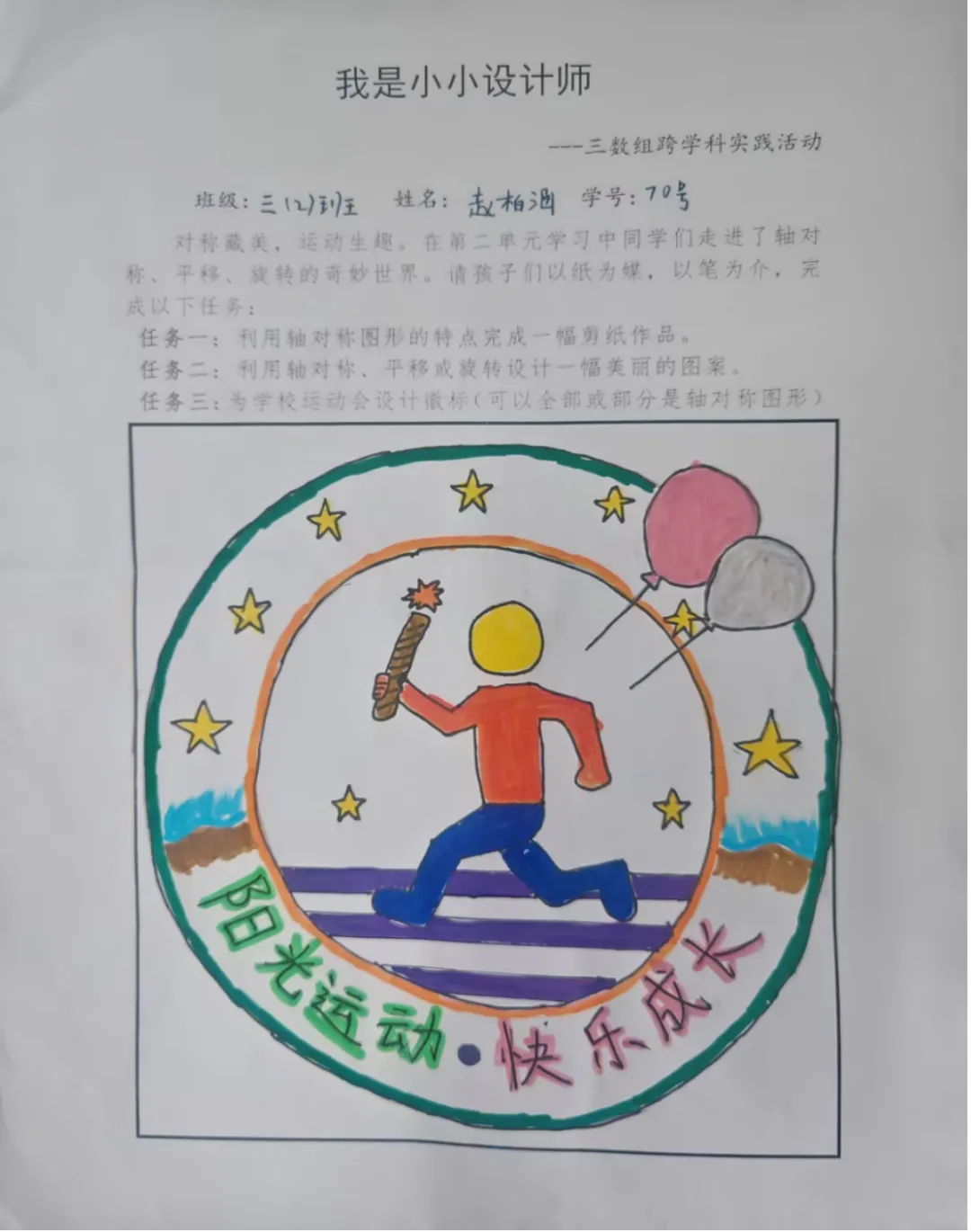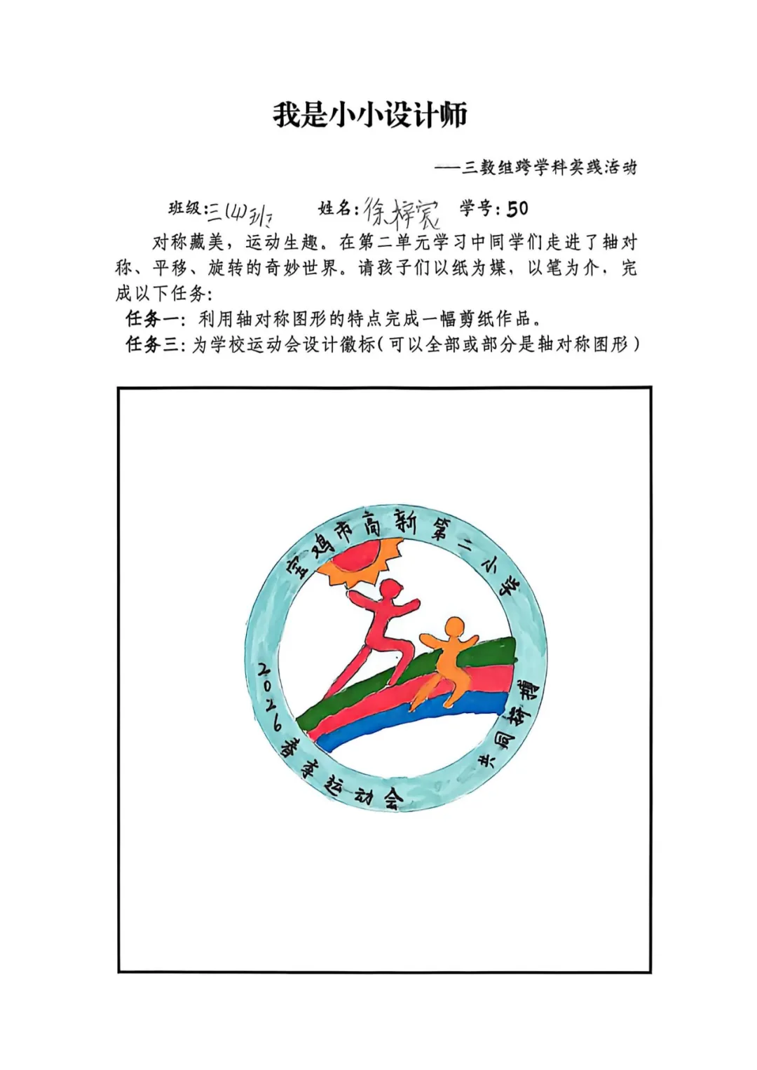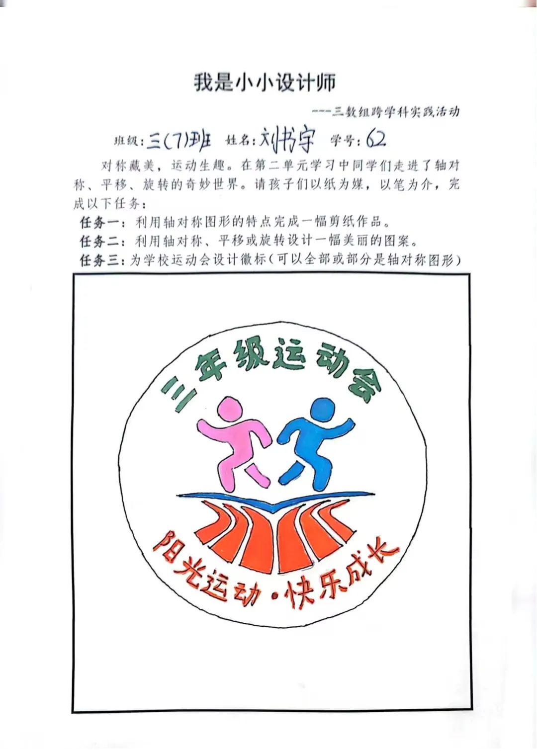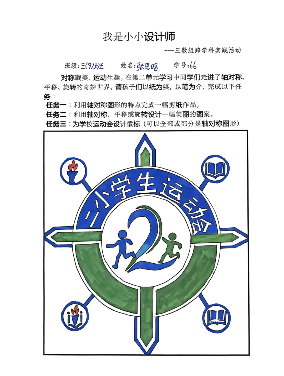 化身 “小小设计师”,同学们为即将到来的学校运动会量身打造专属徽标。大家巧妙融入轴对称元素,将运动精神、校园特色与数学知识相结合,设计出一枚枚充满活力、寓意美好的运动会徽。徽标构图简洁、造型对称、主题鲜明,既体现了公平向上的体育精神,又彰显了数学在生活设计中的实用价值。
