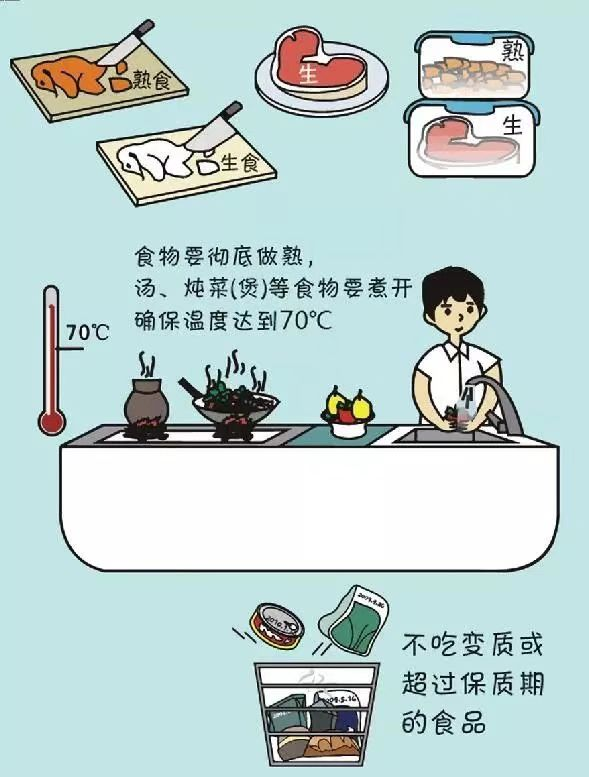 不吃生冷食物;食品在食用前要煮熟、煮透,尤其是贝壳、甲壳类等海产品;隔夜食物食用前要彻底加热;食物制作加工要生熟分开,生熟食品分开存放;生吃瓜果蔬菜要洗净。