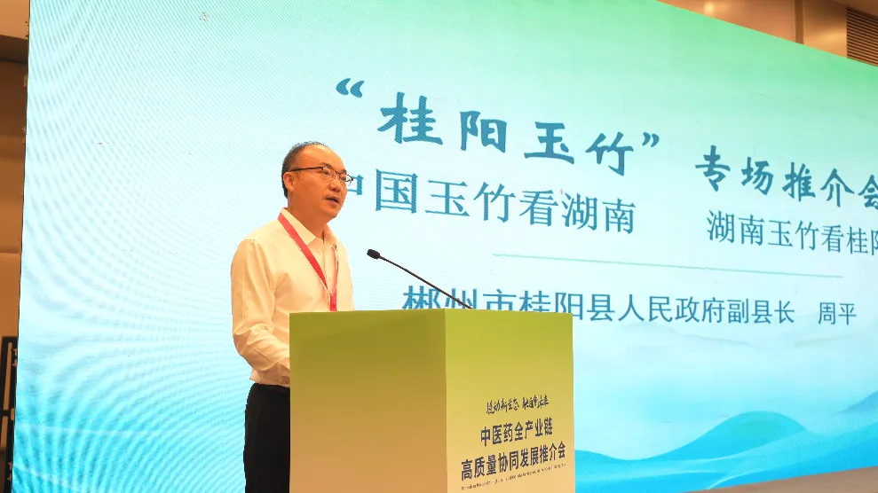 副县长周平在中医药全产业链高质量协同发展推介会上,全面介绍桂阳作为湘玉竹核心主产区的资源禀赋、产业规模、品牌优势及全链条布局成效,并诚挚邀请广大药企、投资商、科研院所走进桂阳考察洽谈,携手深耕玉竹及道地药材产业,共建中医药产销协同新格局,合力打造 “中国玉竹之乡”,共享大健康产业发展红利。