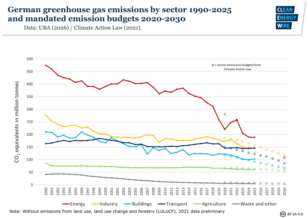 气候变化专家委员会(Expertenrat für Klimafragen)表示1,德国2026年气候行动计划(2026 Climate Action Programme)“极不可能”足以实现具有法律约束力的减排目标。