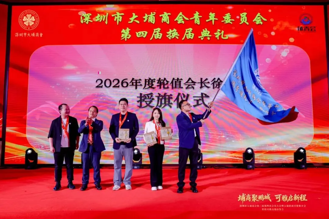 为做好代际传承工作,大会期间,深圳市大埔商会青年委员会(埔青会)新一届领导班子正式亮相,并举行了埔青会2026年度轮值会长授旗仪式。