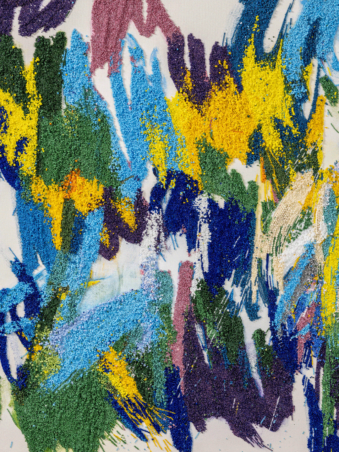 与油彩不同,珠子无法混合、稀释或冲淡。“它们是纯粹的色彩,盛装在玻璃之中,”艺术家说,“这使它们有着类似刚刚从被颜料管里挤出来的质感。” 明暗对比是通过精心排列的相邻色彩关系实现的,一旦完成,就很难修改或去除。从远处观看,笔触如同奔放的书法线条;近看,它们则化作由一粒一粒、一抹一抹色彩组成、广袤而复杂的风景。