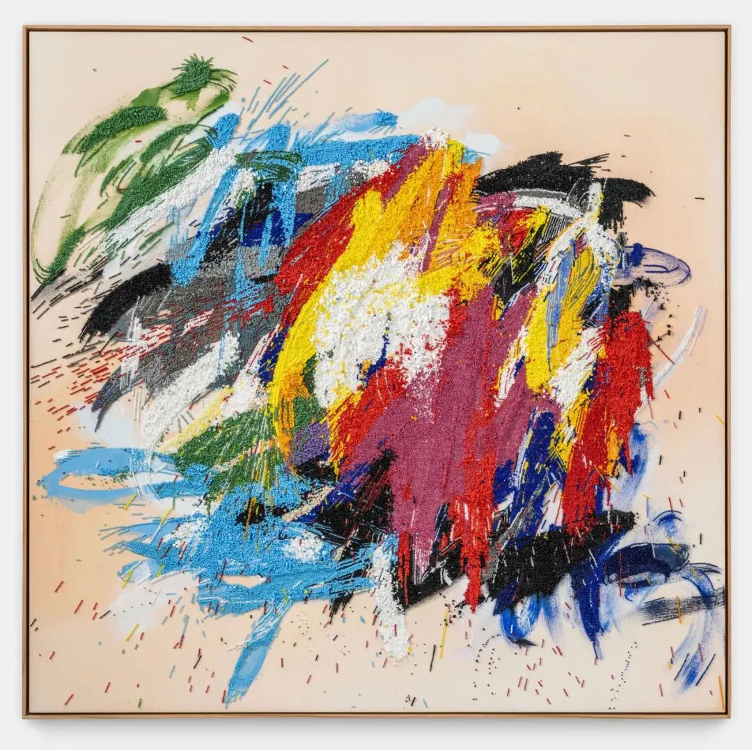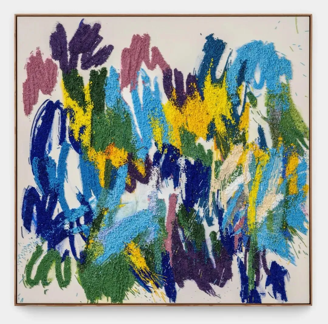 从20世纪90年代的大型雕塑和装置作品(现被纽约惠特尼美国艺术博物馆和华盛顿特区国家美术馆等主要收藏机构收藏),到2005年至2020年间创作的极简主义、以社区为基础的串珠编织作品,丽莎艺术语言的核心始终是对概念及过程的强调。如果说她早期的作品强调的是高强度、漫长的创作过程和凝聚性,那么这一系列极具表现力的抽象绘画则呈现了她的全新探索:使用材料作为一种直接的、个人化的载体进行表达。成簇的黄色、靛蓝色、蓝色、粉色、红色、绿色和淡紫色珠子栖身于在她厚重的笔触之中,闪烁的色彩与每一个抒情的笔触唱和。丽莎独自创作,不再像以往那样一针一线地通过重复来积累意义,而是像使用调色板一样挥舞着这些珠子:它们或被随意地抛洒在画布上,如同细小的彩色水滴般散落;抑或同色粉一般被混合在油彩之中——每一颗玻璃珠似乎都在放大她所用材料的不溶性。