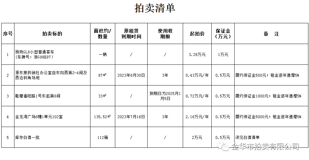 受委托,本公司将于2023年5月18日(星期四)10时在金华市婺州街76号5楼拍卖: