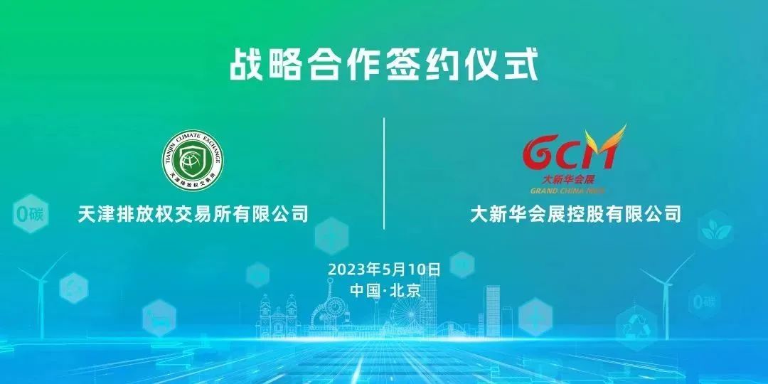 2023年5月10日上午,大新华会展与天津排放权交易所战略合作签约仪式在北京举行。出席此次会议的有,大新华会展董事长兼总裁倪晖,高级副总裁韩明华,北京公司副总经理樊鹏,市场采购部总监牛嘉;天津排放权交易所董事长高正琦,副总经理吕本庆,以及创新业务部总监张顺。