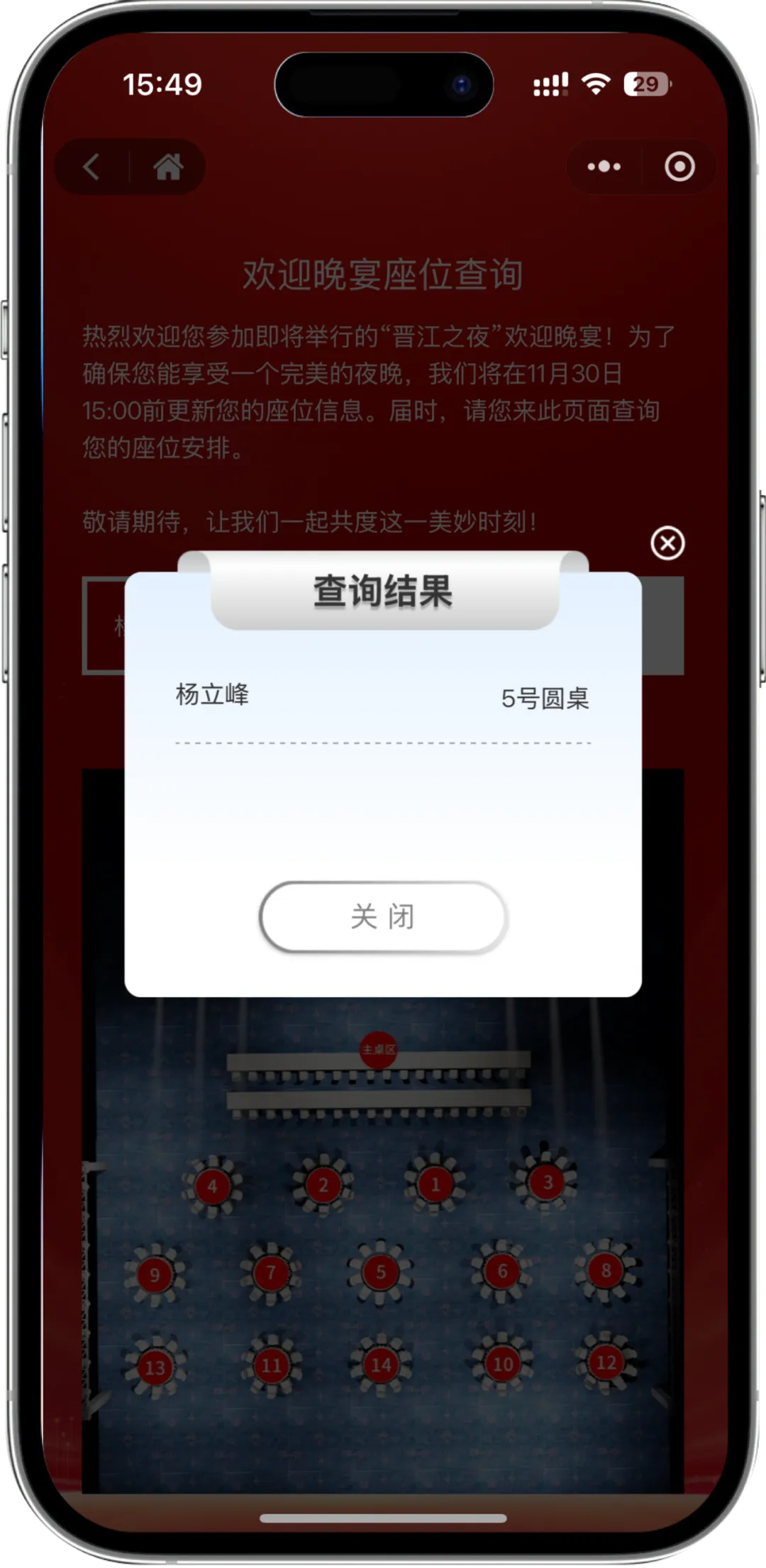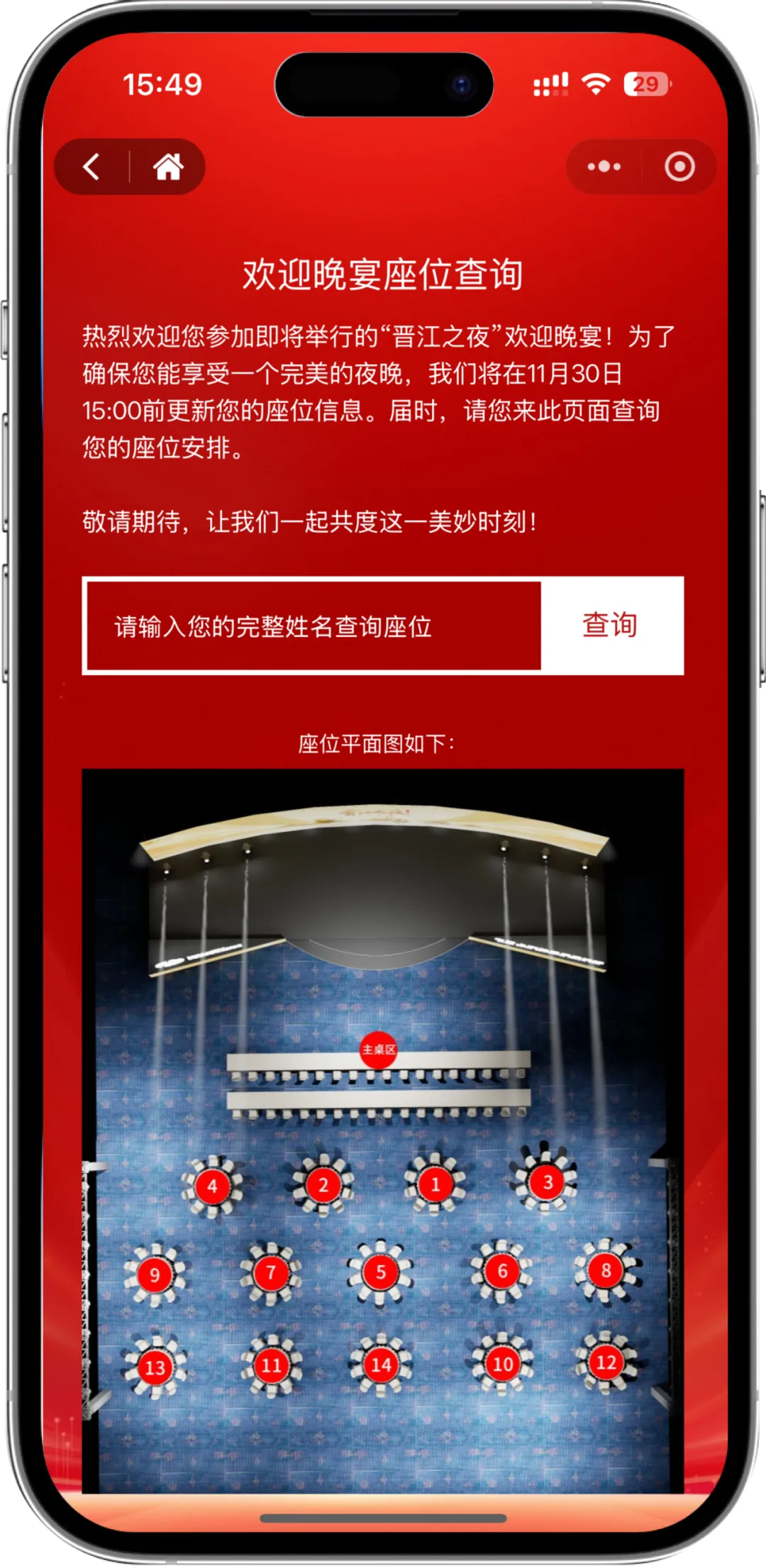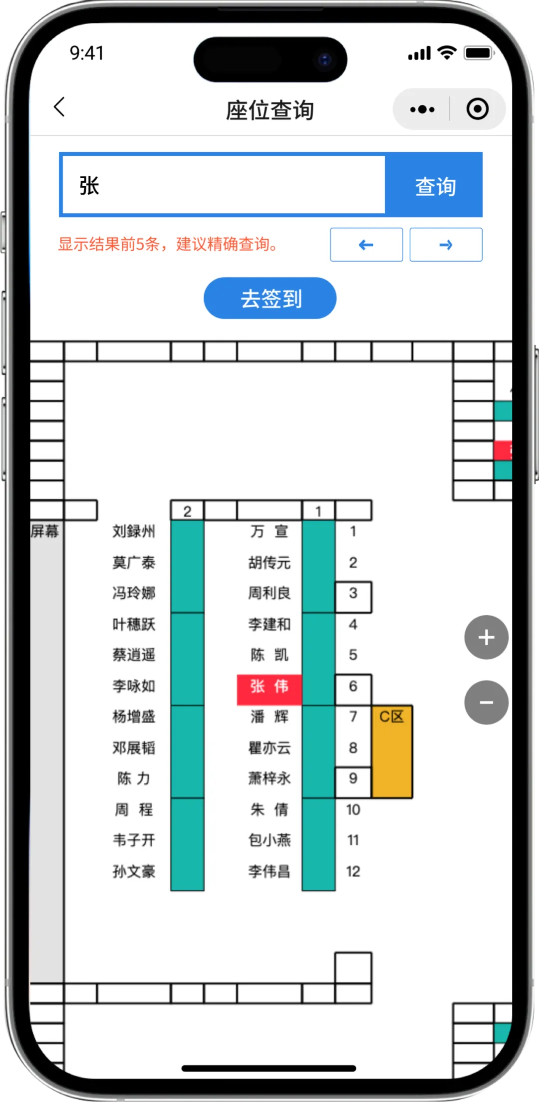 眨眼猫会务智能体主办方后台一键上传 Excel 座位表,实时更新修改;参会者手机端输入姓名即可快速查座、精准定位。