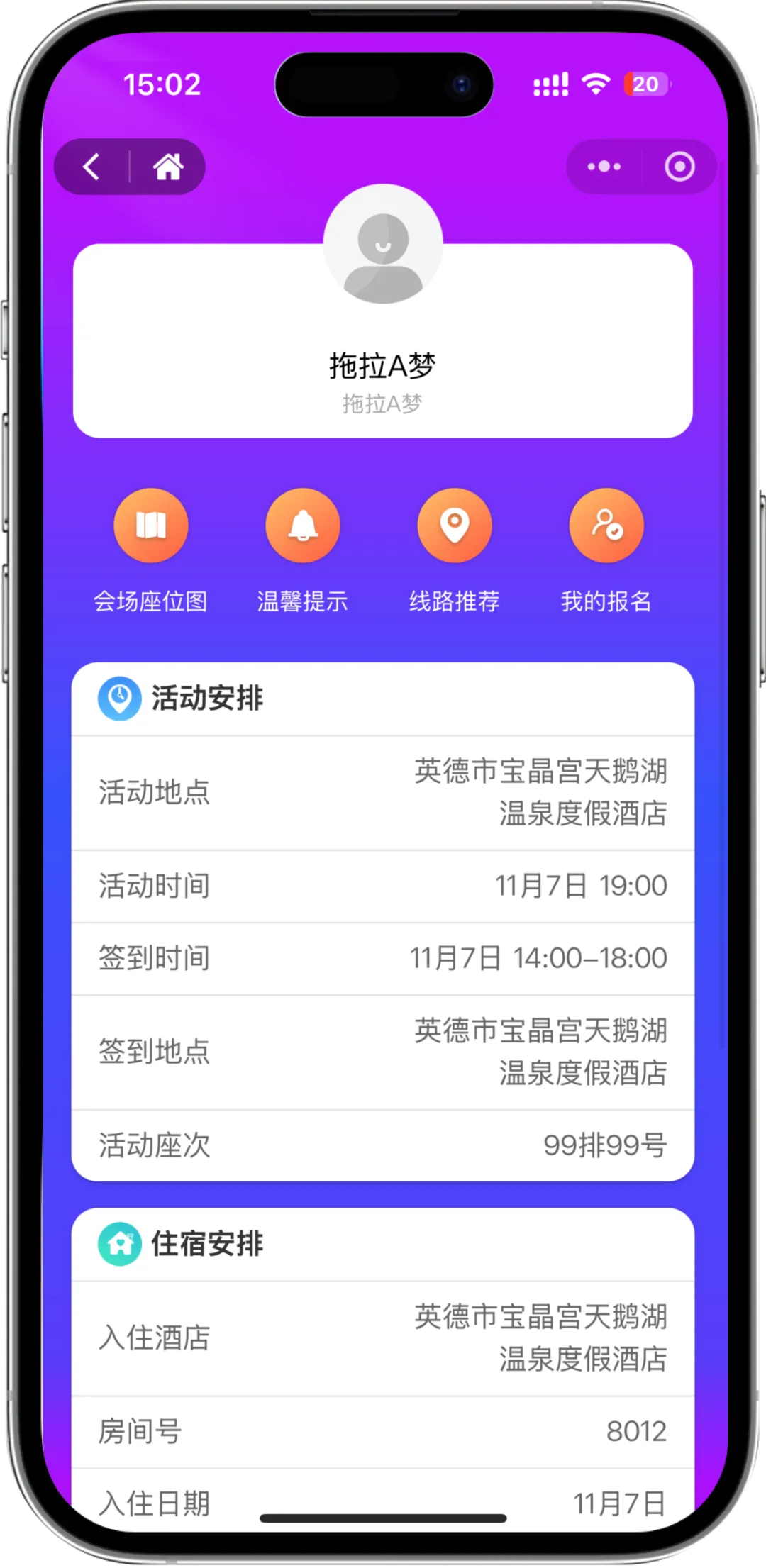 眨眼猫会务智能体支持参会者自助查询座位、房间号、就餐信息、乘车信息。所有信息可自定义实现“千会千面”。无需反复咨询工作人员,大幅降低现场压力。