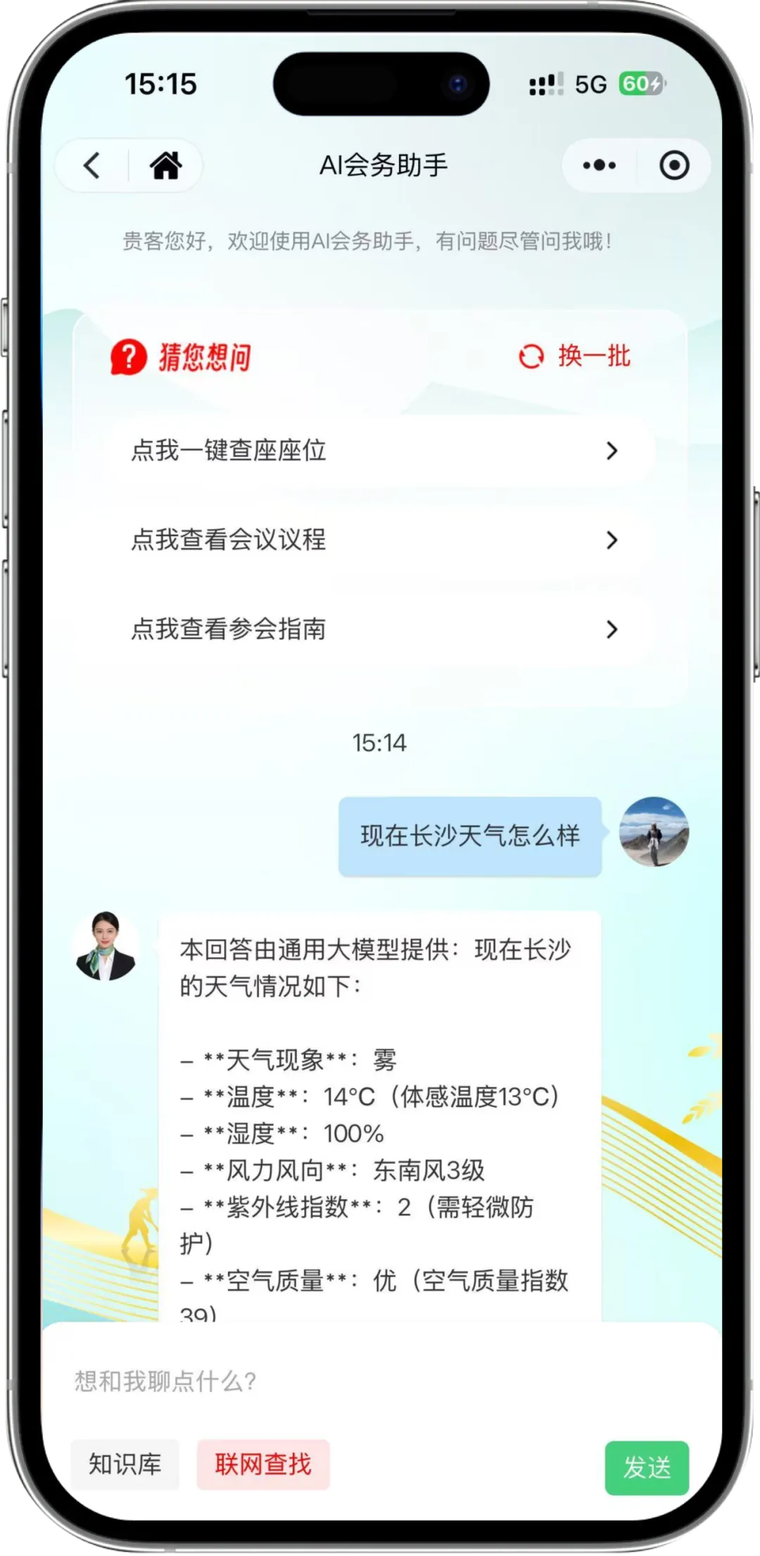“国际论坛外宾多,AI 助理自动答疑,查座、导航一键搞定,外宾都说方便。”