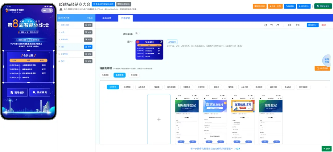 自助版模板丰富、点哪儿改哪儿,所见即所得,无需开发、无需 IT 团队,普通行政、会务人员即可快速搭建专属会务小程序,当天搭建、当天上线、当天使用。