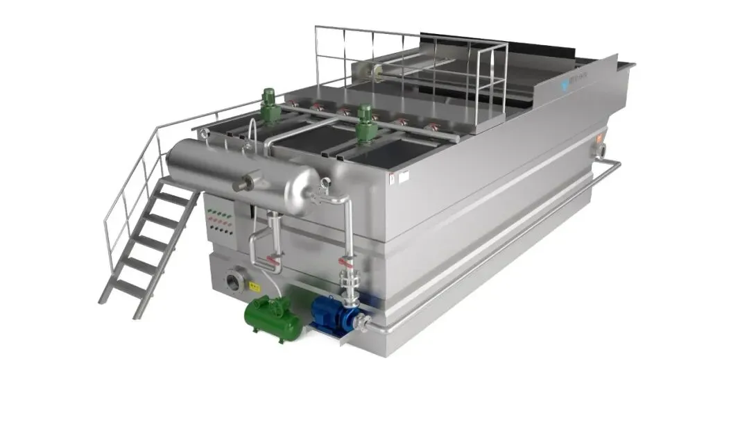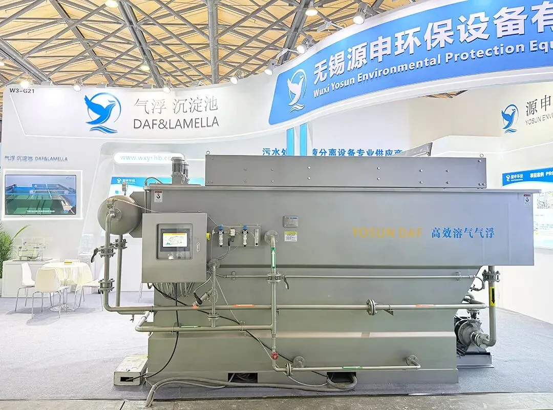 展会现场,源申环保的气浮机实物正在平稳运行。微气泡从溶气系统中源源不断地释放,与模拟废水充分混合,形成清晰的固液分离效果。观众可以清楚地看到悬浮物被微气泡携带至水面,再由刮渣机构自动收集排出。