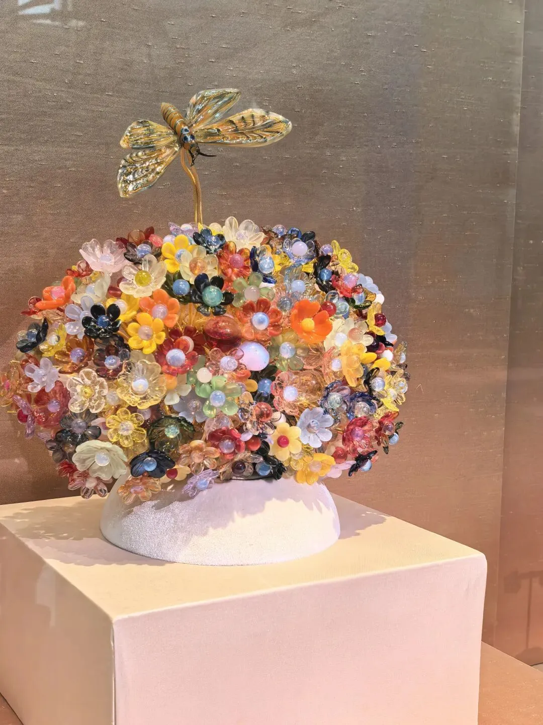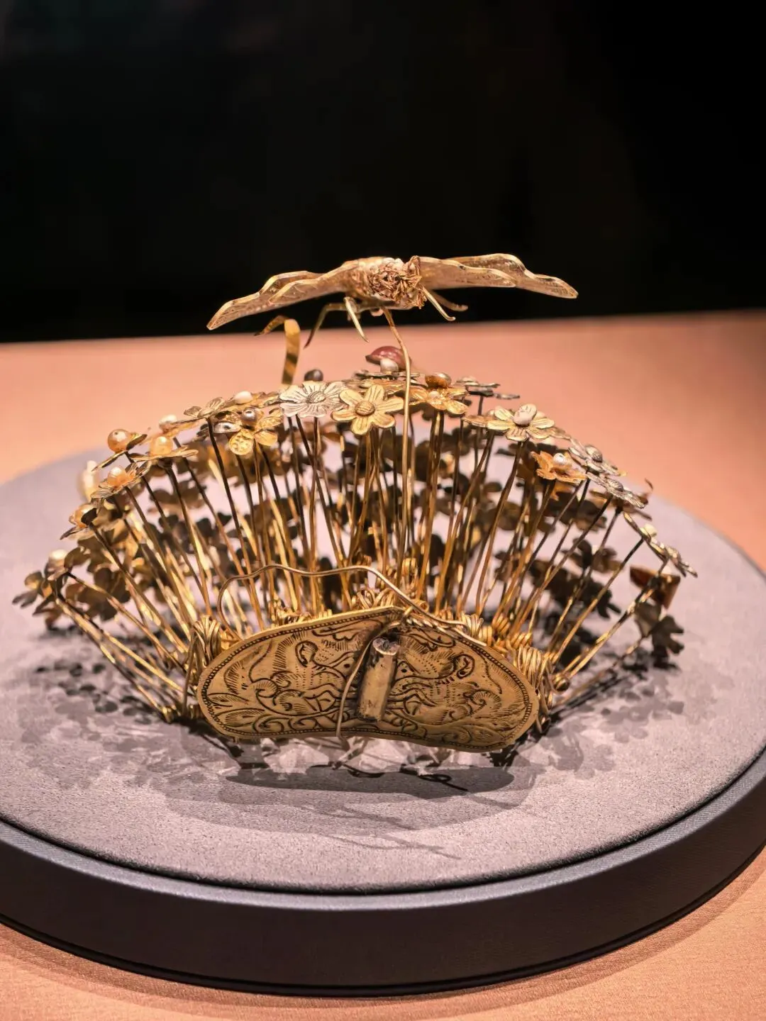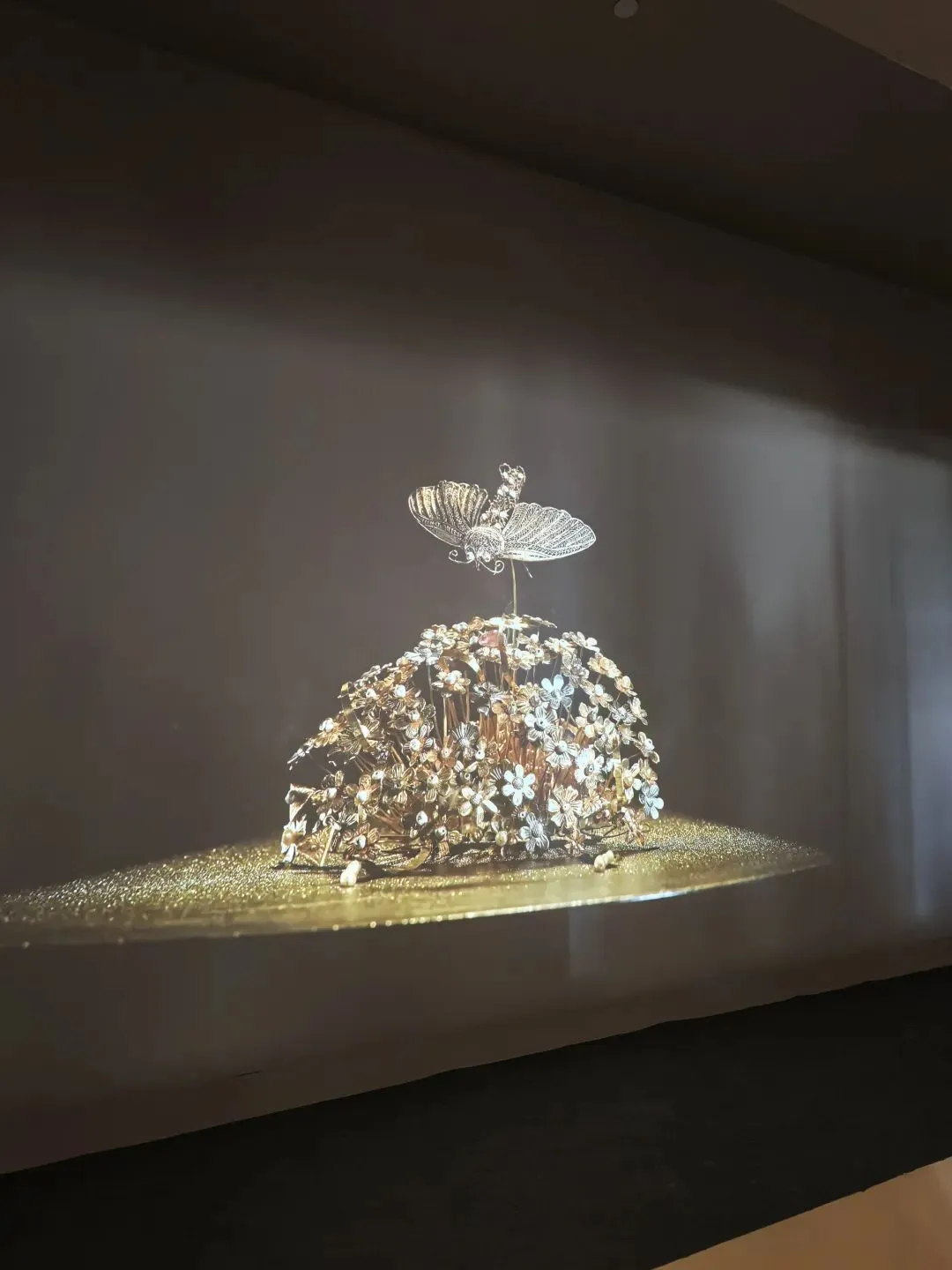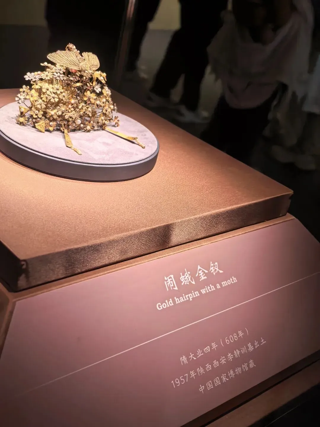 △来自山东淄博的非遗灯工琉璃传承人孙奉柱、刘晨湘师徒,用琉璃材质复刻了的闹蛾金钗,在国博一楼大厅展柜里能看到。不得不说还是古代版本好看。