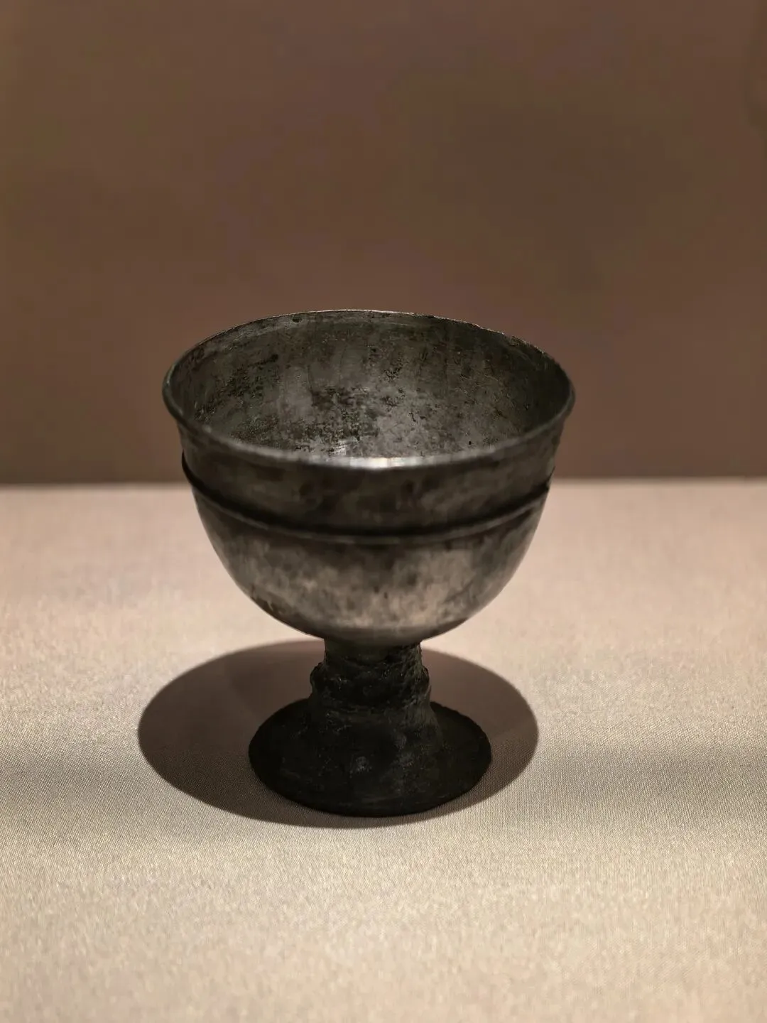 高足杯的器形来源于西方,是丝绸之路文化交流的见证。杯子设计精巧,整体线条流畅,凸弦纹体现器物的层次感。杯体与足部的焊接工艺娴熟,说明隋代金银器制作的高超水平。这杯子挺符合现代人审美。同时出土的,还有长相一样的银杯,有学者认为,金杯、银杯、玉杯小巧可爱,都是为小孩子特制的杯子。