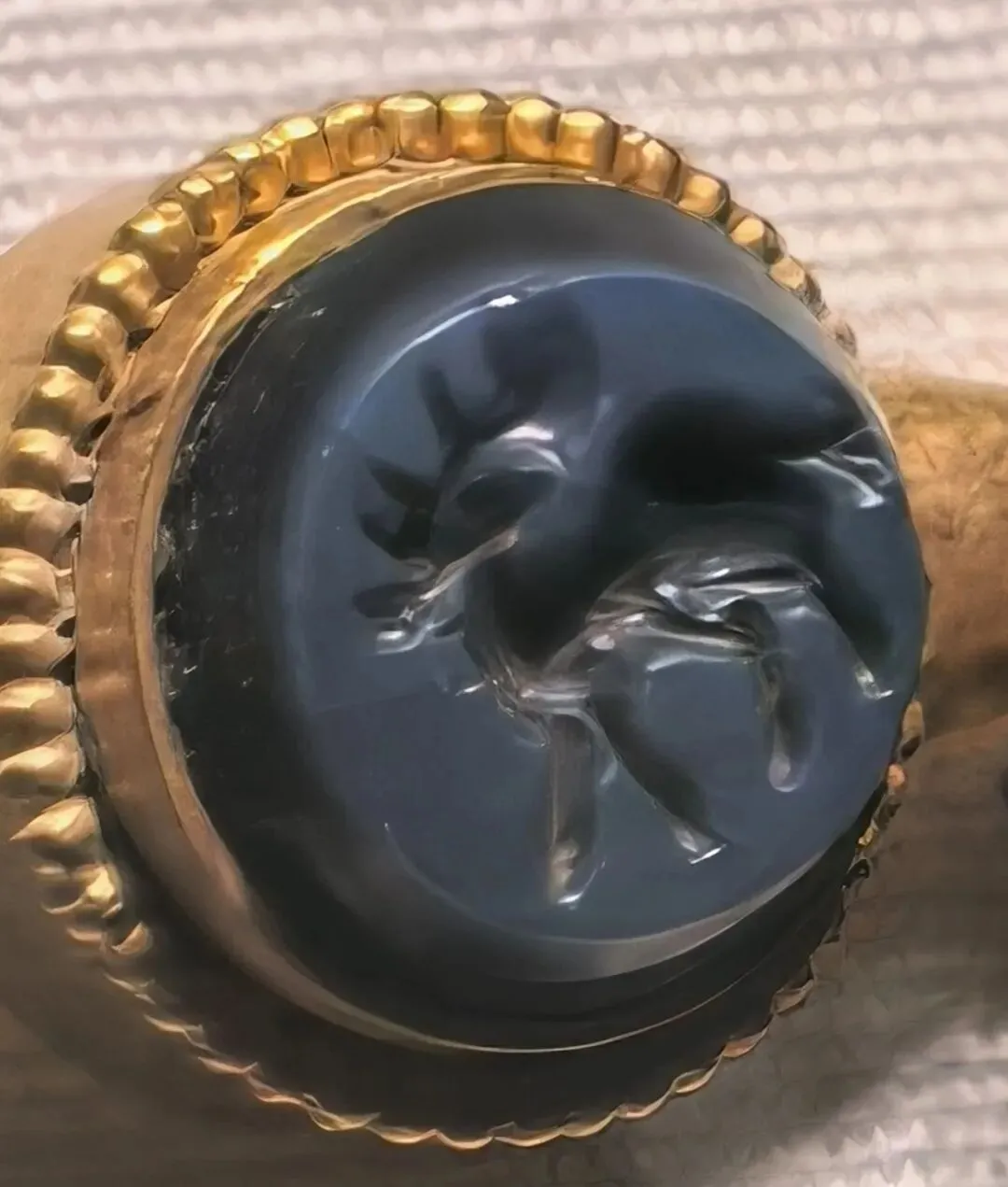 一定要看细节!顶部有蓝色青金石,顶部中央蓝色宝石上,仔细看,会看到凹雕的大角鹿。下面有28颗金球,像极了爆米花,每颗球由12个小金环组成,每个小金环上镶嵌10粒珍珠,除了珍珠外,每个小金环上还有金色小焊珠一圈和大焊珠5颗。底部有一颗鸡血石,鸡血石也镶嵌了一圈24颗小珍珠。鸡血石下有一颗心形的青金石宝石。不得不说,比现在的金饰设计美太多了!