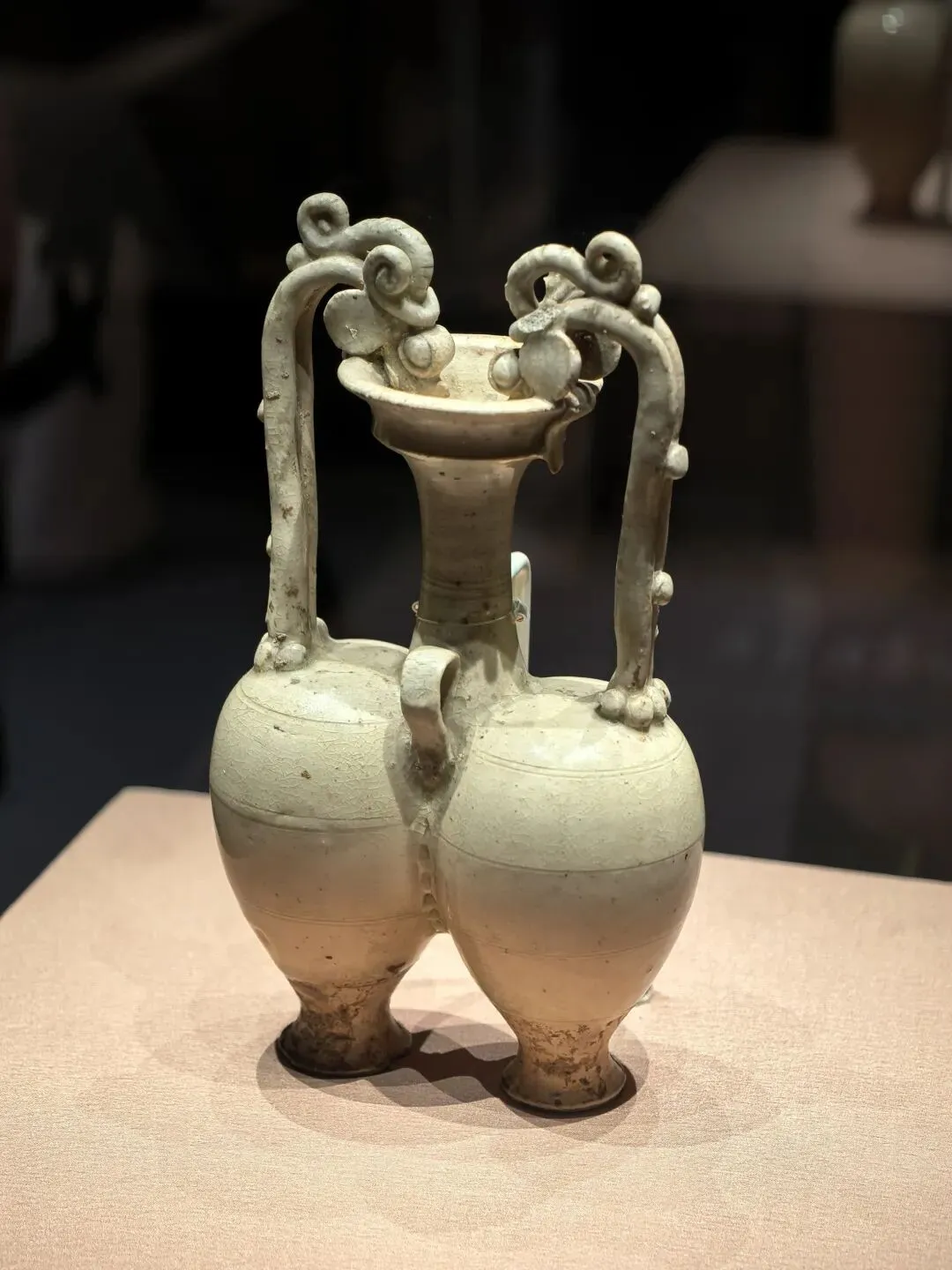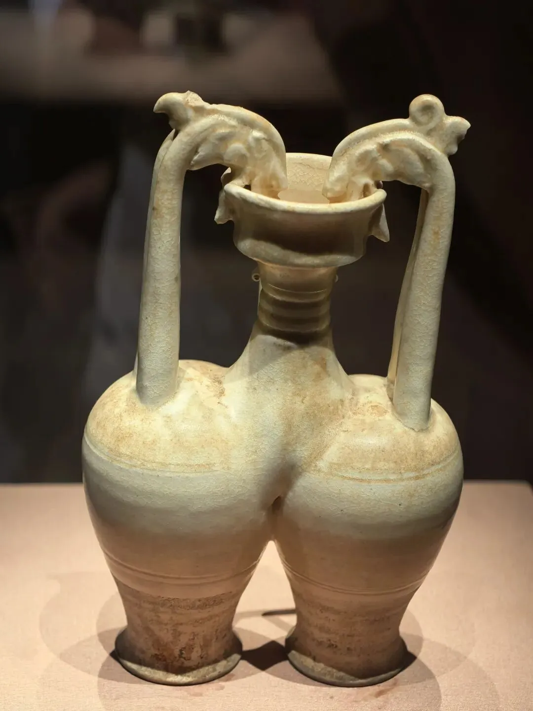 天津博物馆的这件隋代白瓷瓶,代表了隋代白瓷的最高工艺。它底部的字,更是珍贵,告诉了世人,它叫传瓶,有两个肚子相连(並bing,也就是“并”的意思)。这是一件酒器,对称式双腹造型非常独特,两条龙如同在争相饮酒,看资料,说它既具北朝和隋代瓷器所特有的浑厚凝重,又不乏灵秀活泼,其线条刚柔相济,是隋代创新的器型。