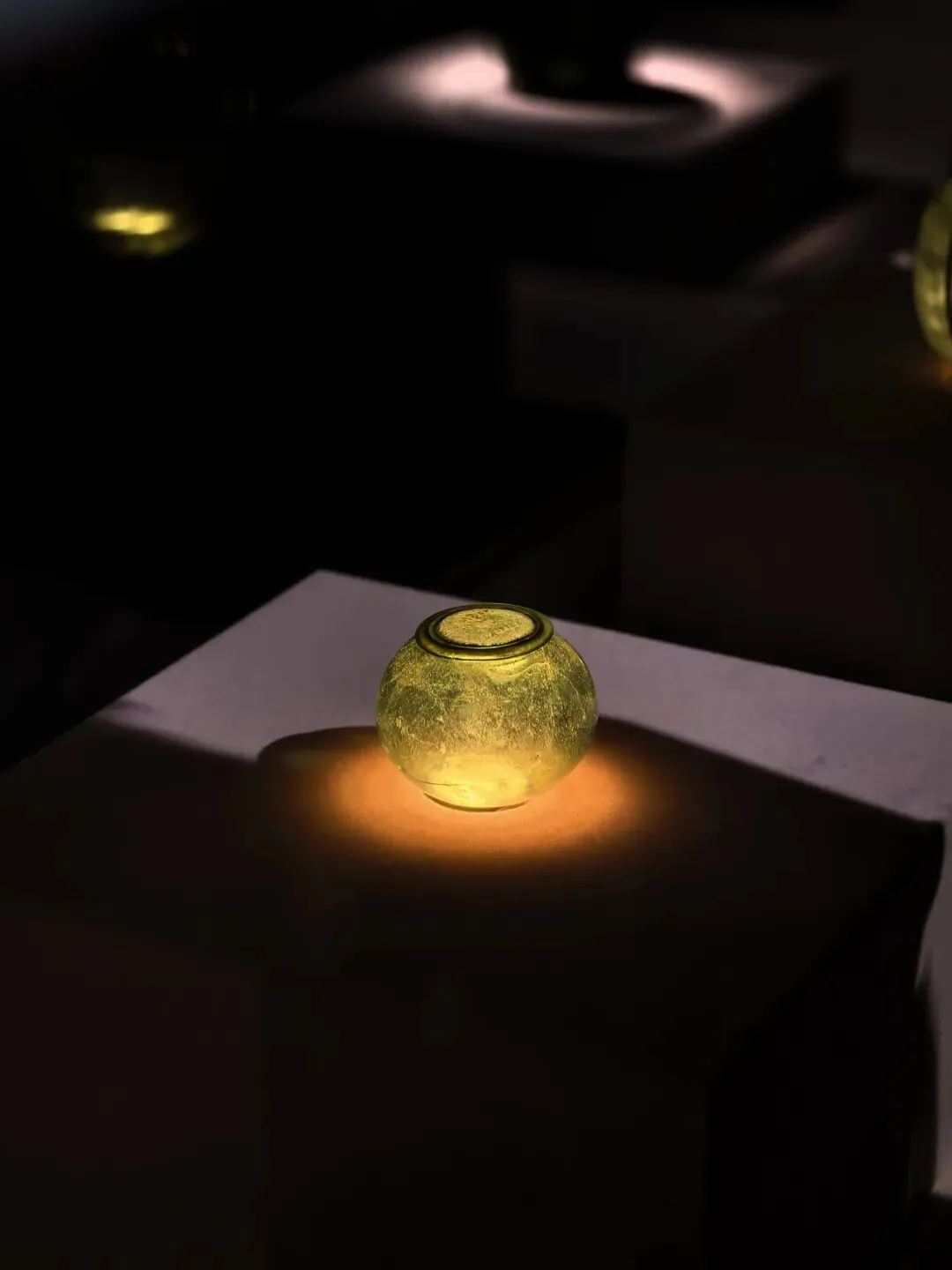 △绿玻璃盖罐,隋大业四年(公元608年),国博藏,李静训墓出土。推测是用来放香料或香薰。它外形小巧,底部最薄处仅0.2毫米。