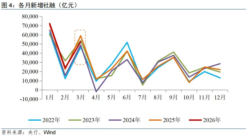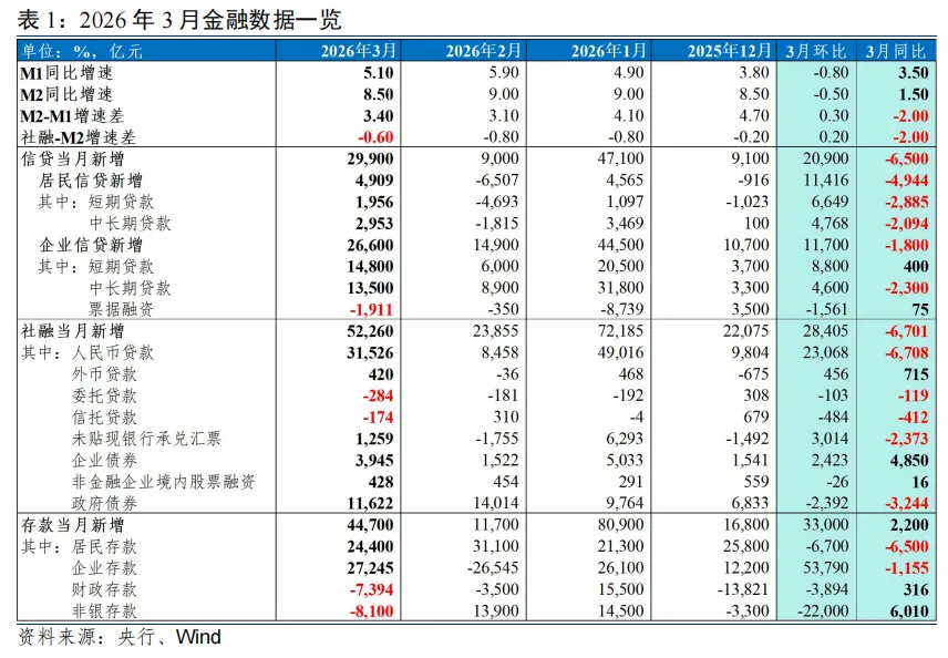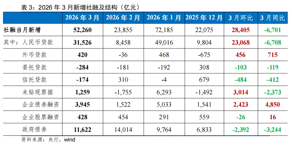 3月为传统信贷大月,季节性因素叠加经济基本面整体向好,贷款投放强度较2月有明显提振。尤其是春节后企业复工复产节奏加快,带动生产经营景气度提升,加上前期政策协同发力、“十五五”开局之年下重大项目密集落地,投资端活跃度改善带动部分融资需求好转。但考虑到债贷替换效应、“总量合理增长、投放节奏均衡”的政策导向以及“生产-消费”的循环尚需畅通,3月新增信贷延续同比少增态势,季末冲量强度不及近年同期,信贷增长呈现更加平稳均衡特征。