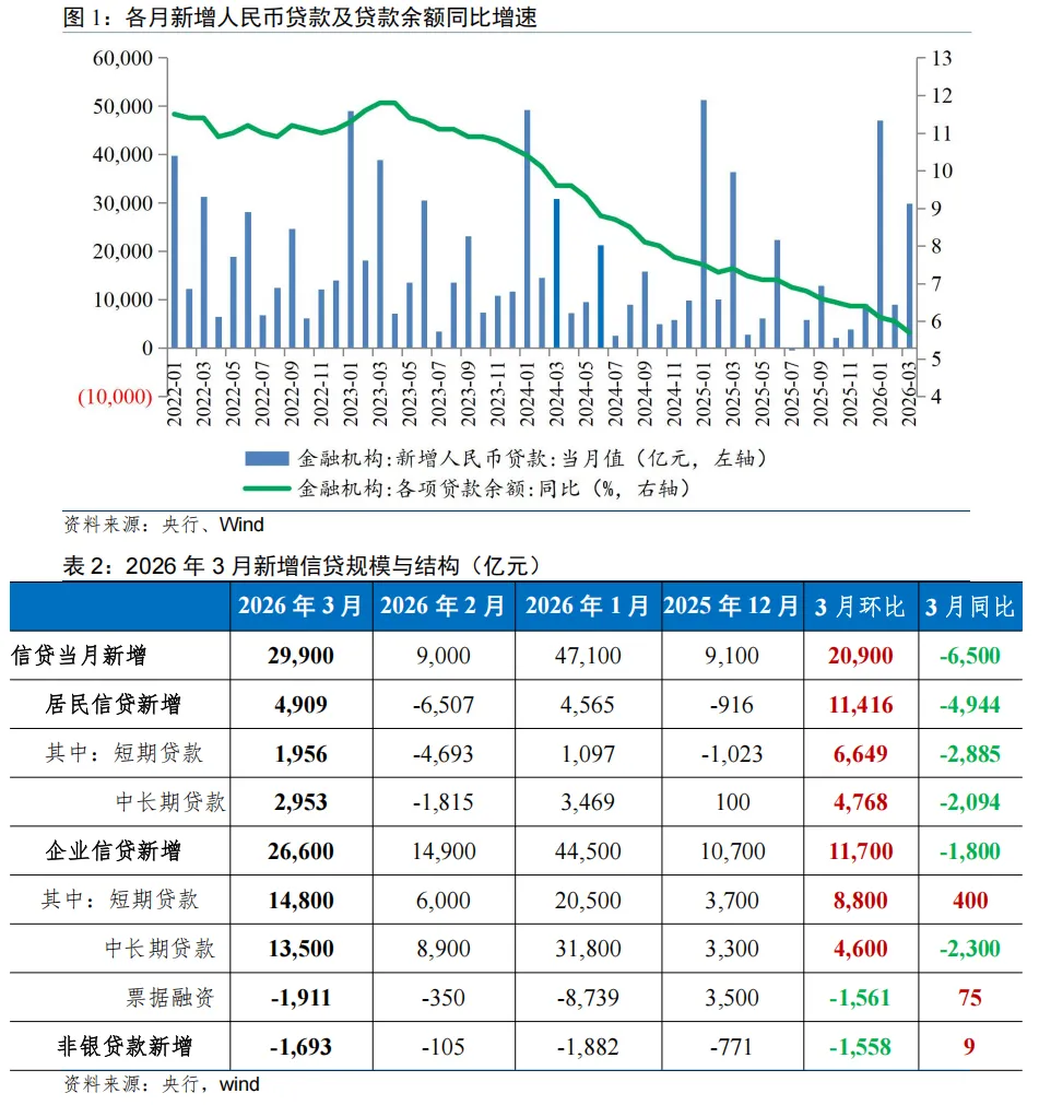 2026年3月,人民币贷款增加2.99万亿元,同比少增6500亿元,环比多增2.09万亿元,信贷增速回落至5.7%。一季度,人民币贷款增加8.6万亿元,同比减少1.18万亿元。总体看,今年1月、3月作为传统的“信贷大月”,贷款冲量现象有所缓解;2月不仅是季中“小月”,还额外受到春节效应等下拉因素影响,但信贷增长仍然比较平稳,信贷增长呈现出更加平稳均衡特征。