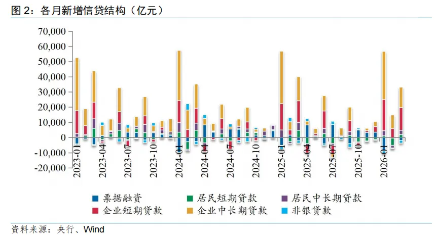从信贷结构看,对公贷款继续发挥“压舱石”作用,零售信贷景气度边际改善但整体仍偏弱,“对公强、零售弱”格局延续,短贷和票据融资之间仍存跷跷板效应。