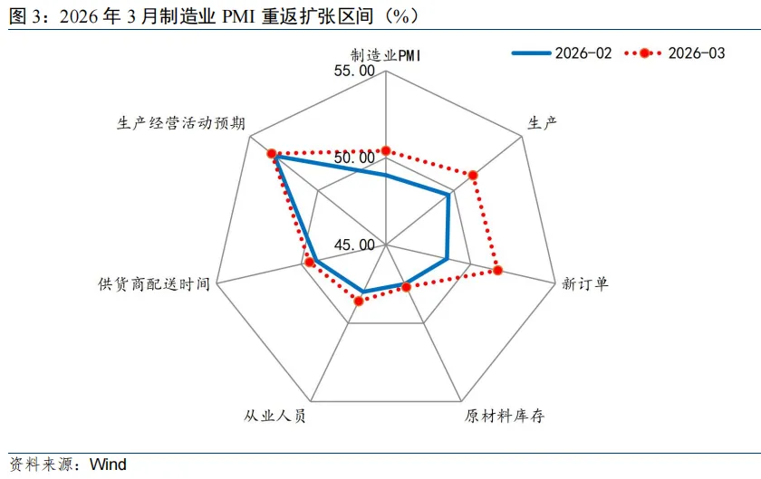 对公端,短贷增长较好、中长贷相对稳定,短贷-票据跷跷板效应延续。一是从经济环境看,3月制造业PMI重返扩张区间,较2月提升1.4pct至50.4%,其中新订单、新出口订单、生产指数分别较上月提升3、4.1、1.8pct至51.6%、49.1%、51.4%,产需指数同步回暖,企业投资扩大再生产诉求升温,带动部分融资需求好转。二是季末月份企业端上下游货款、员工工资、税费等集中支付,结算性资金融资需求上升,对短期流贷投放形成支撑。同时,银行仍有通过法人透支、国内信用证、福费廷等对公短贷替代低息票据冲量情况,短贷--票据跷跷板效应延续。三是“十五五”重大工程项目加速落地,季末月份财政发力加码,用于建设项目的新增专项债加快发行,相关项目配套融资需求有所提振。数据显示,3月建筑业PMI环比上行1.1个百分点,一季度国家电网和南方电网完成固定资产投资分别同比增长37%和49.5%。四是社会融资条件处于较为宽松的状态,财政金融政策协同扩内需,针对中小微、民营和科技企业的信贷支持力度增强,以及隐性债务置换规模比去年同期有所下降等综合影响下,3月新增企业贷款保持较高景气度。