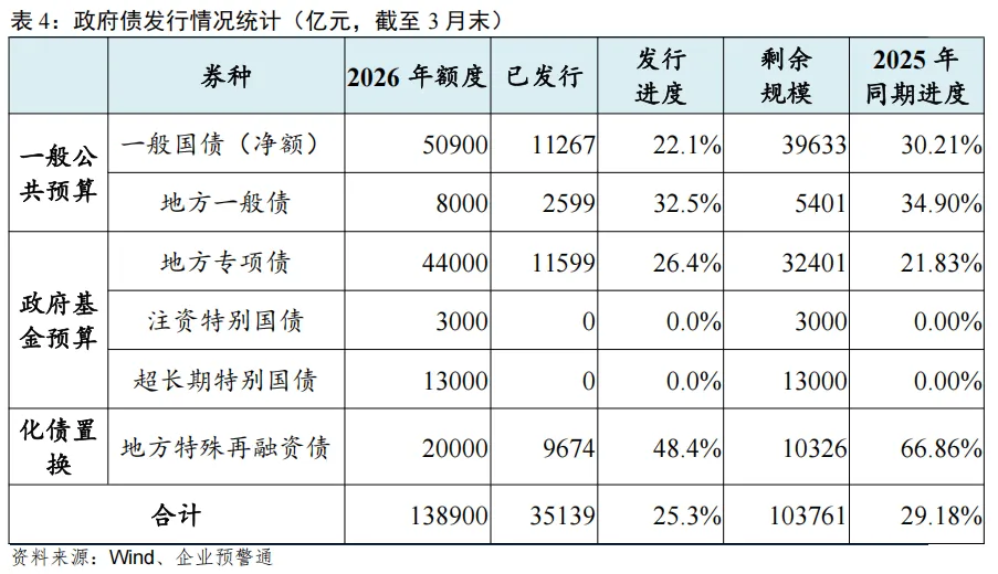 在此背景下,二季度财政仍将延续积极取向,在一季度已实现较快发行进度的基础上,更加注重节奏优化与政策协同。一方面,政府债发行仍需维持相当强度,以支撑不确定环境下的稳增长与扩内需目标;另一方面,宏观政策取向一致性下需协调好政府债发行节奏。整体来看,二季度政府债供给有望提速,国债或迎来发行放量,地方债发行节奏有望继续保持平滑,二季度高峰可能出现在5月。