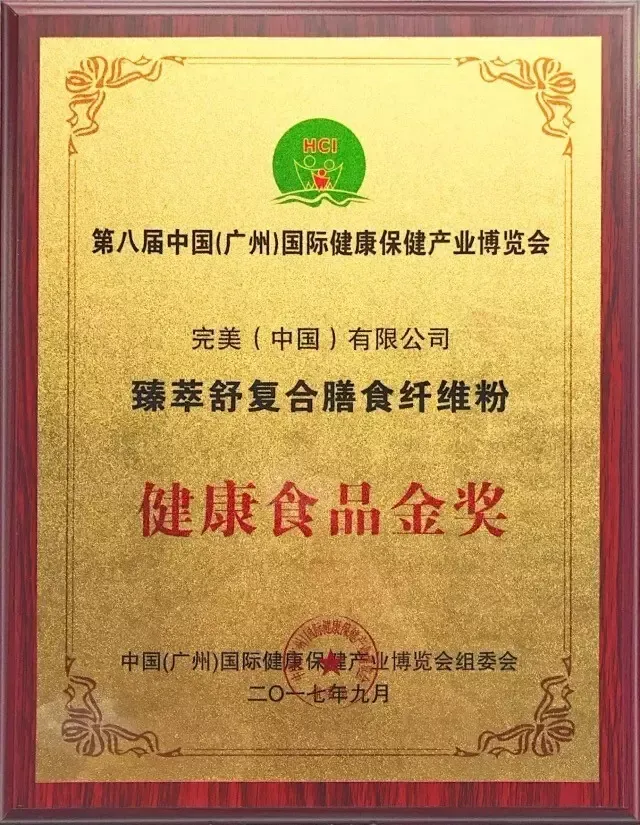 臻萃舒复合膳食纤维粉在众多的健康保健产品当中,脱颖而出,荣获第八届中国(广州)国际健康保健产业博览会颁发的“健康食品金奖”,印证了完美产品追求健康的高品质。