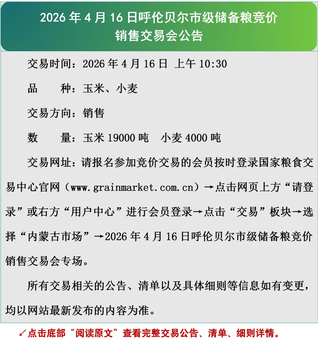 2026年4月16日呼伦贝尔市级储备粮竞价销售交易会公告