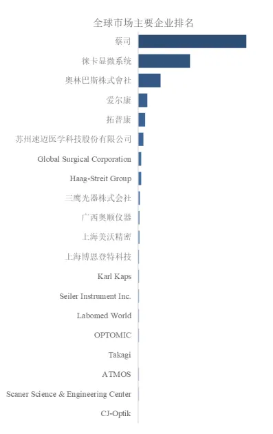 蔡司、 徕卡显微系统、 奧林巴斯株式會社、 爱尔康、 拓普康、 苏州速迈医学科技股份有限公司、 Global Surgical Corporation、 Haag-Streit Group、 三鹰光器株式会社、 广西奥顺仪器、 上海美沃精密、 上海博恩登特科技、 Karl Kaps、 Seiler Instrument Inc.、 Labomed World、 OPTOMIC、 Scaner Science & Engineering Center、 Takagi、 ATMOS、 CJ-Optik