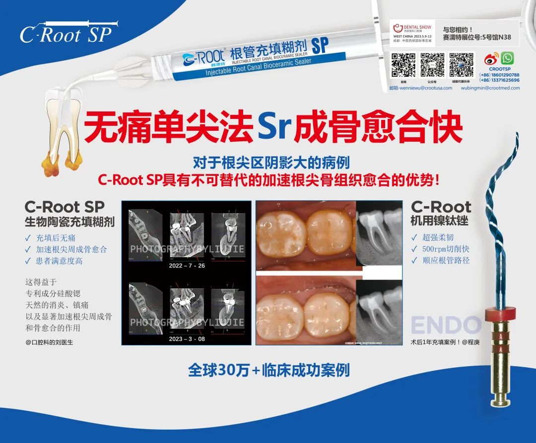 本次参展的新型硅酸锶C-Root SP,通过单尖法/热牙胶/冷侧压等充填方法,可完美助力牙科医生完成侧枝根管、根尖分歧、Delta区及牙本质小管等细小根管区域充填,起到有效的封闭作用。
