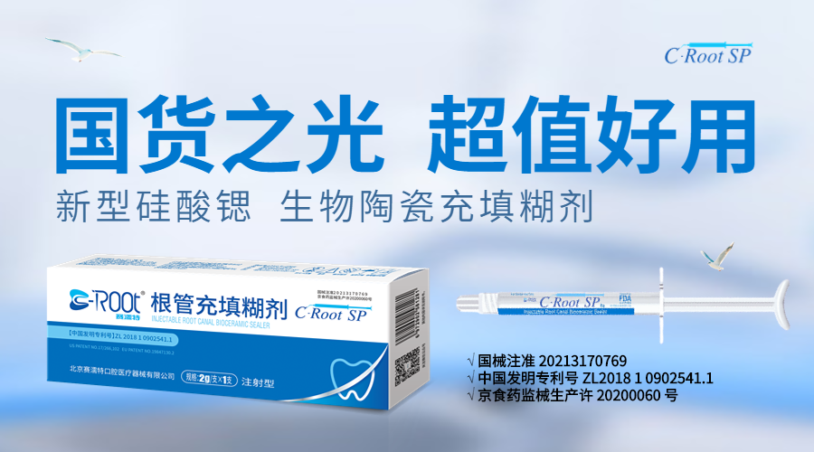 作为赛濡特自主正向研制的一款国产生物陶瓷糊剂,C-Root SP主料硅酸锶,天然止痛药,自身杀菌性强,不携菌,根据YY0717-2009 IDT ISO6876:2001测量的凝固时间约为8-10h,可实现全场景不同类型的根管病例充填,具备良好的生物相容性和强抗菌能力,拥有术后无痛、少量超充可原位成骨及根尖周愈合快的能力。