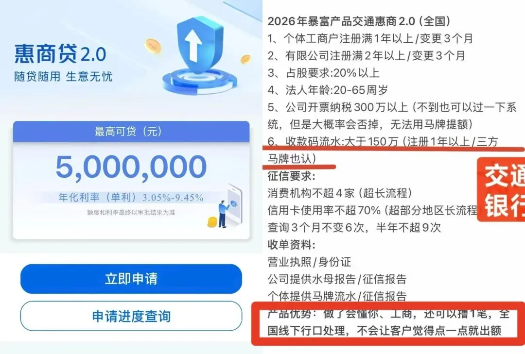 交通银行专属企业贷款福利来袭!惠商贷2.0、科创贷款、普惠e贷三大核心产品,全部支持先息后本还款方式,极大缓解企业资金压力,更有到期无本续贷政策,彻底告别资金断档难题!