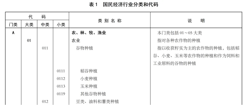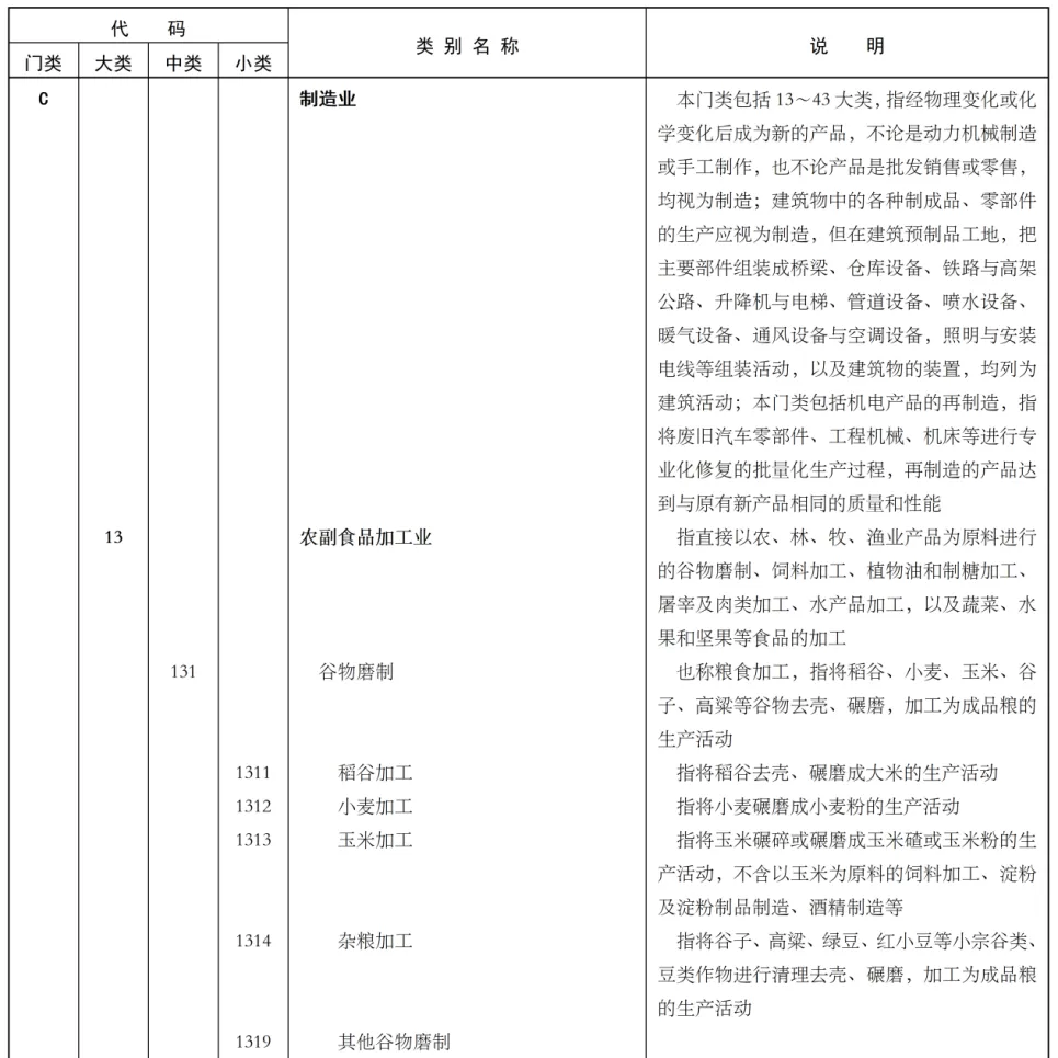 代码采用4级结构,由1位拉丁字母+4位阿拉伯数字组成,将所有经济活动分为20个门类,再将各个门类细分为多个大类、中类、小类。其中门类代码采用大写字母表示,码值为A~T;大类代码采用2位阿拉伯数字表示;中类代码为2位数的大类代码加上1位中类顺序号组成,码值为3位阿拉伯数字;小类代码为3位数的中类代码加上1位小类顺序号组成,码值为4位阿拉伯数字。比如:C=制造业(门类)、13=农副食品加工业(大类)、131=谷物磨制(中类)、1311=稻谷加工(小类)。这样一来,任何一项经济活动,都具有了唯一的“身份证号”。