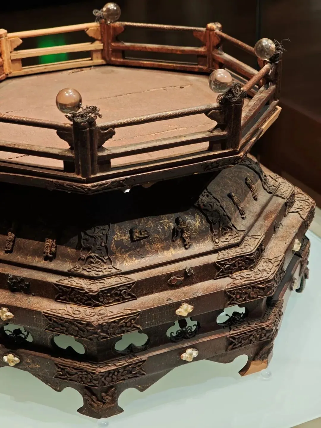 苏州博物馆藏真珠舍利宝幢原件中的八角底座、须弥山构件、黑漆嵌螺钿经箱、真山大墓出土彩绘漆皮残件等馆藏珍贵文物也回归亮相。