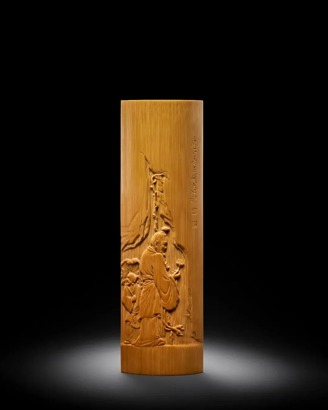 嘉定竹刻,起于明,盛于清,精雅冠绝江南。此艺肇始自明代正德、嘉靖年间的朱鹤,此后便以嘉定为中心,薪传不息。竹刻不仅仅是雕镂之技,它与文人的书斋翰墨血脉相通。明清文人或是亲操刀笔,或是撰稿授意,将诗文之意、书画之境,寄托于小小的竹制臂搁、笔筒之上,使寻常案头之物,升华为集诗、书、画、印于一体的雅逸珍品,承载着中国文人独有的审美情趣与精神寄托。