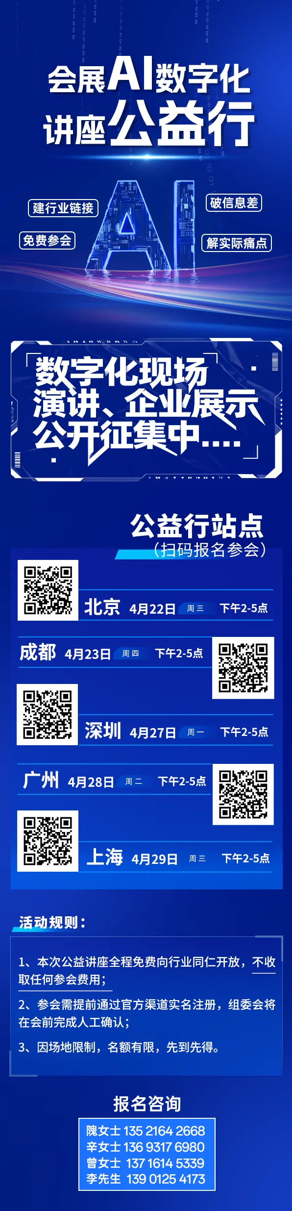 会展AI数字化公益行--北京、成都、深圳、广州、上海,5站日期和地点如下: