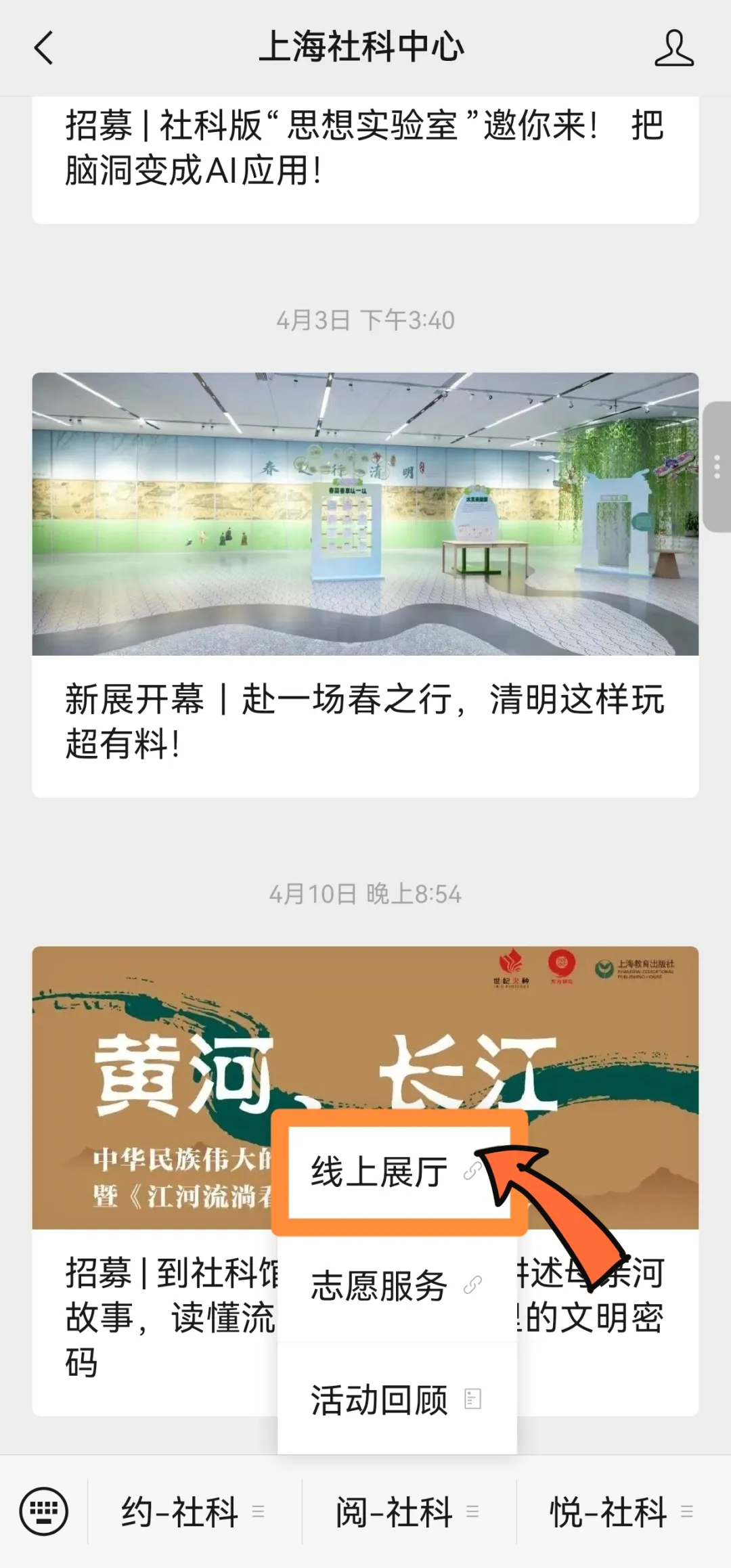 2、进入「上海社科中心」微信公众号,点击下方菜单栏「阅-社科」—「线上展厅」进入在线展厅