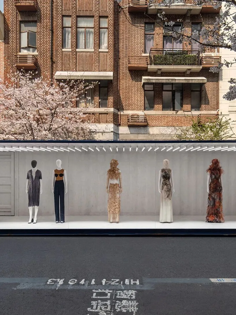 在上海站,这一构思通过一系列直接置入城市公共空间的集装箱装置得以具象呈现。这一空间介入手法延续了OMA为Maison Margiela2026秋冬时装秀所打造的场景设计语言——在那场秀中,层叠堆放的集装箱构建了一个可供观众穿行探索的秀场环境。如今,这些集装箱以展览载体的身份重新登场,集“档案库”、“建筑体”与“街道界面”三重功能于一身。