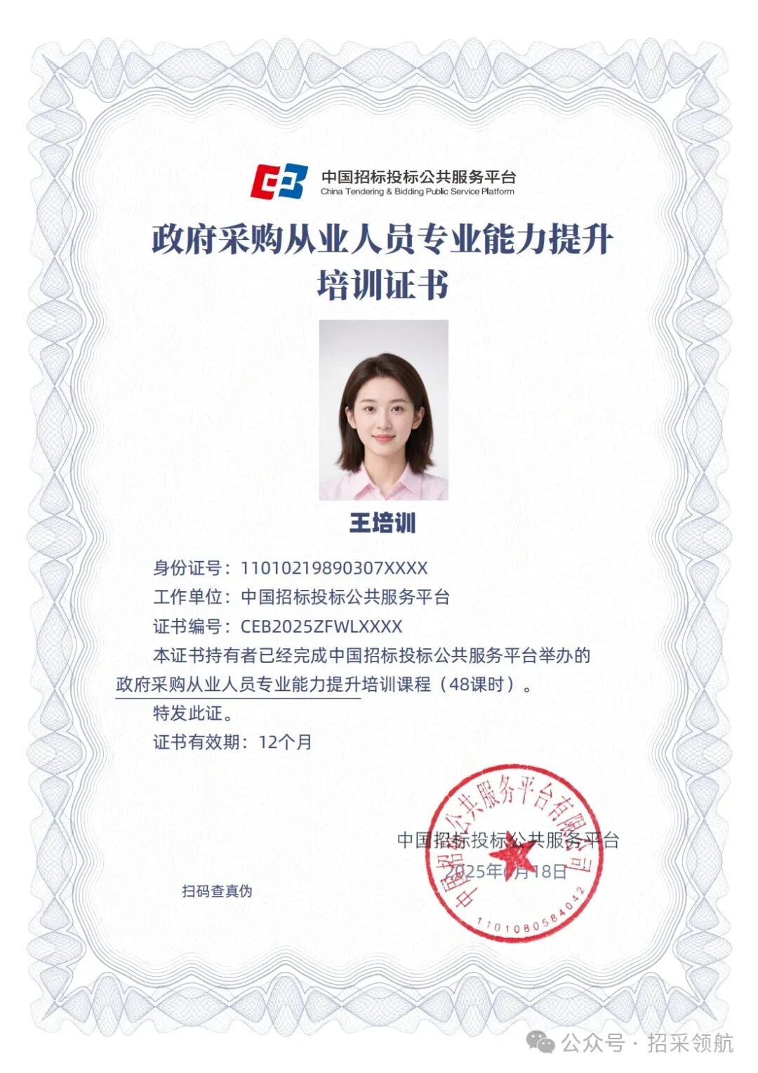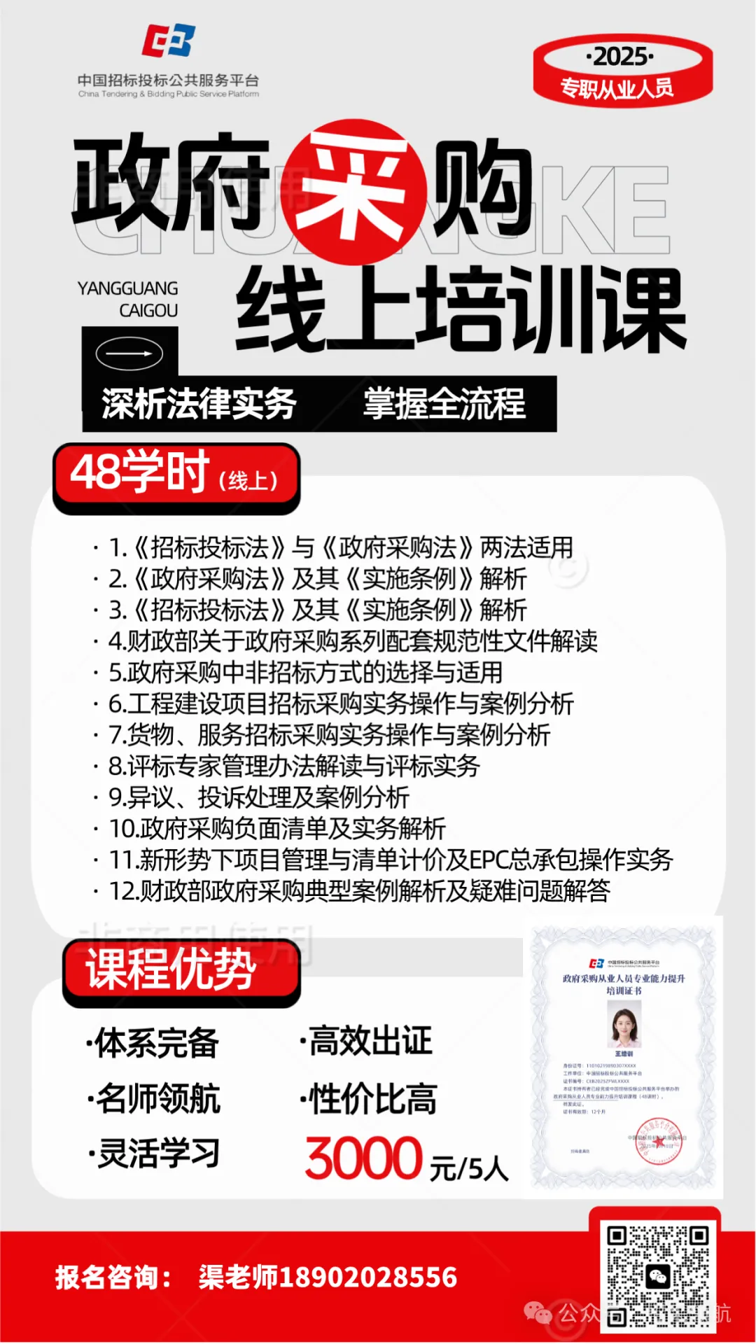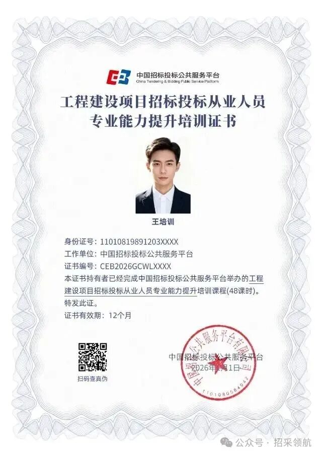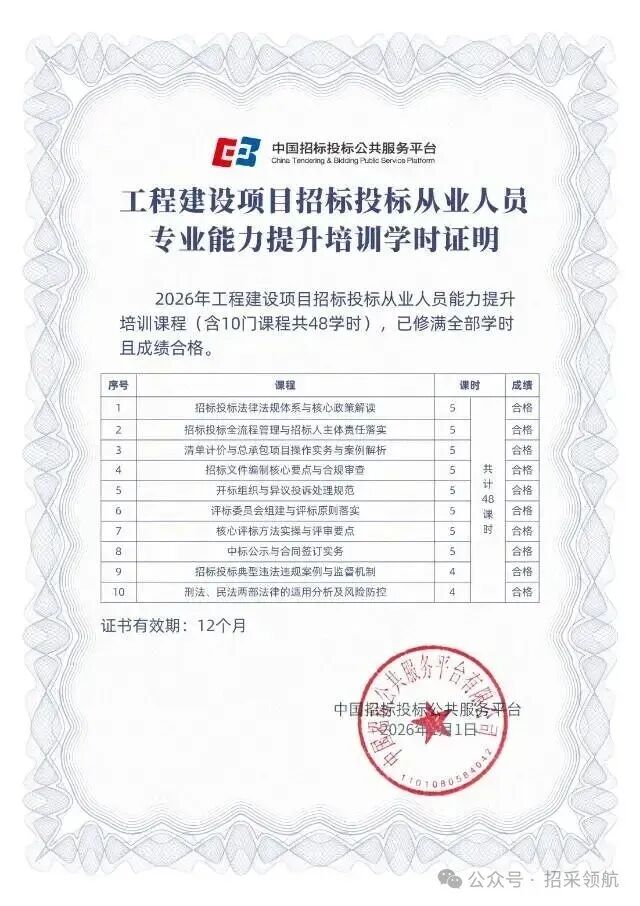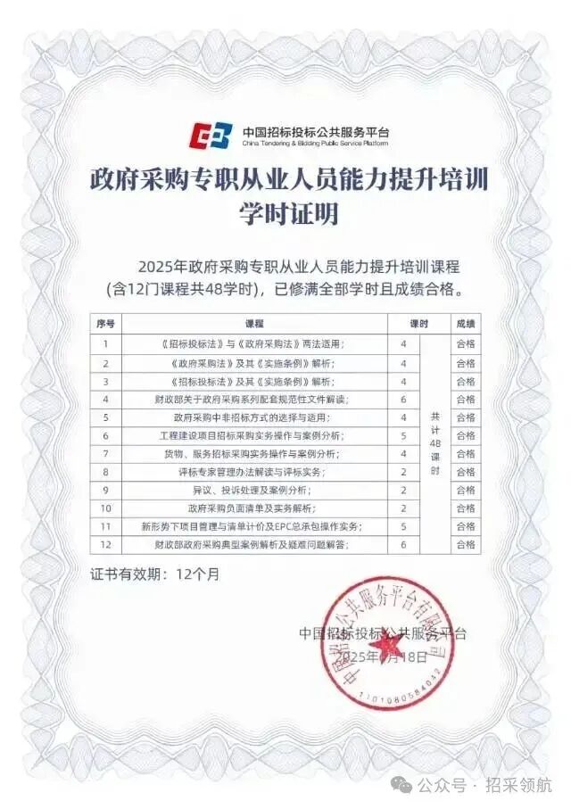国网人员备案证书,完成48学时线上政府\工程采购专职人员系列课程合格后,颁发电子版培训合格证书,可用于政采网和工程网从业人员备案使用,有效期为一年。咨询:渠老师18902028556(同微信)