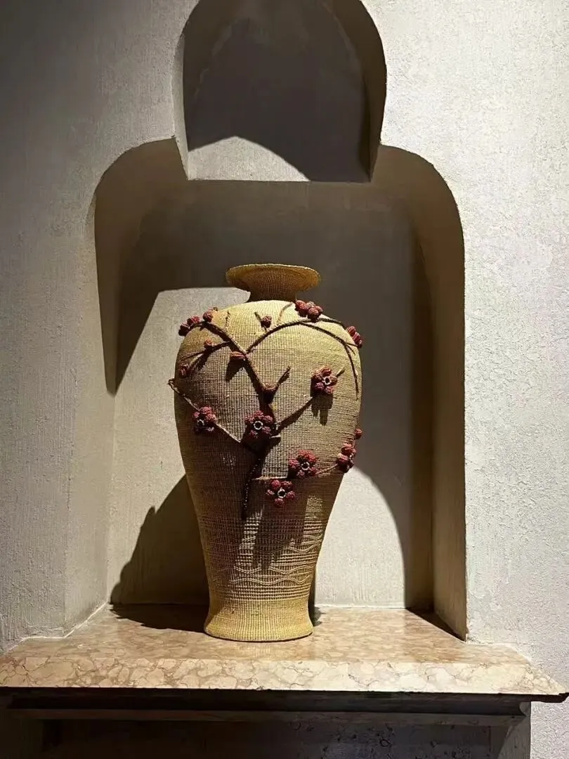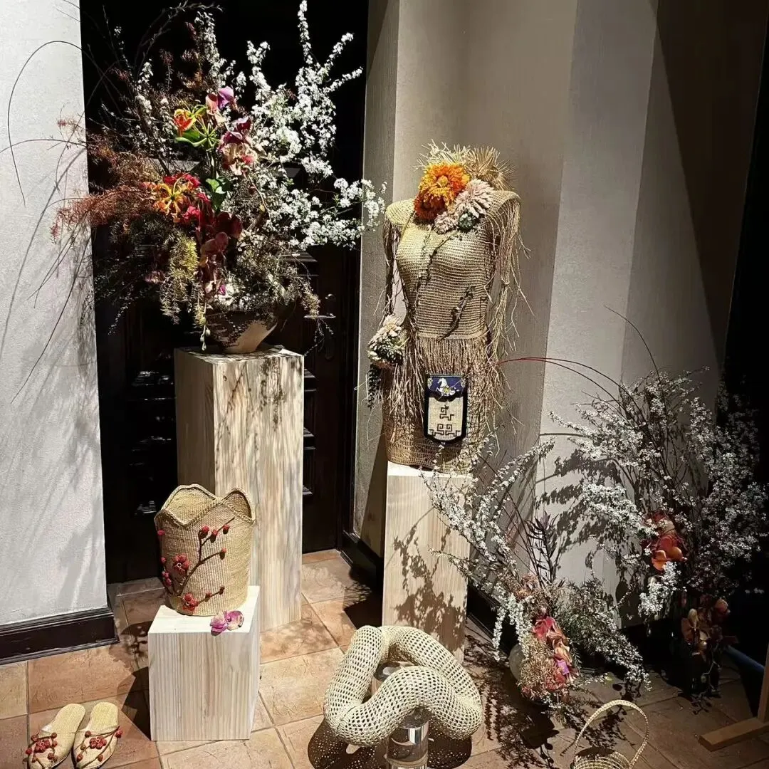 不同于普通草编,徐行草编以“细、匀、洁、韧”为特色,黄草经手工处理后柔韧度大幅提升,可编织出经纬交错的细腻纹理,既保留了草木的天然质感,又能塑造出兼具实用性与艺术性的造型。《锦编岁华》将传统草编技艺与现代花艺设计结合,让原本用于编织草鞋、果篮的老手艺,成为承载江南水乡文化与春日诗意的艺术载体,让非遗真正融入当代审美。