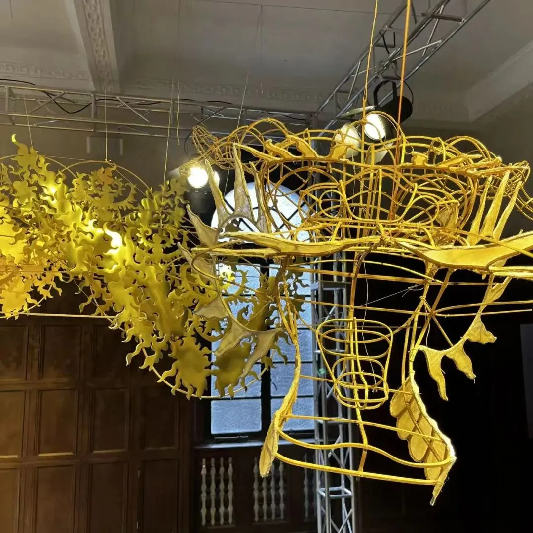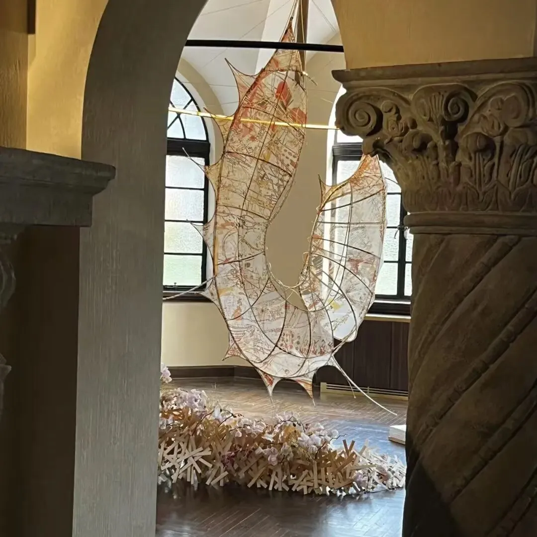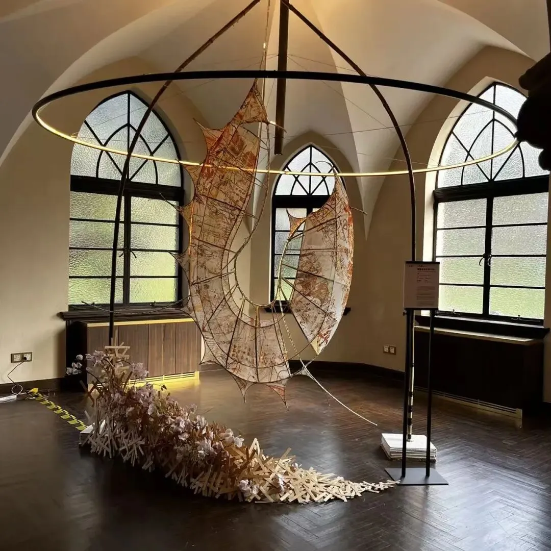 在创作中,秦淮灯彩的传统技艺在表皮生成方式上引入了非结构的观念,使纸痕表皮在张拉、重合与受力过程中成为一种可塑的空间界面,部分表皮结构被刻意暴露,在堆叠与重叠之间,装置从民俗图像转向结构显形,重新组织起建筑内部的秩序关系与居所形态,让非遗灯彩从传统节庆载体,成为承载建筑、历史与空间思考的当代艺术作品。
