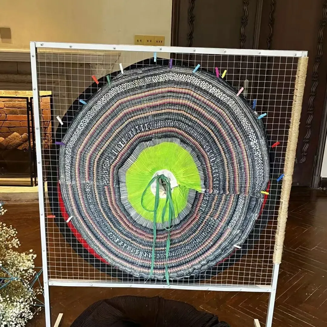 《妹榜妹留》作品以手工羊皮纸(古法造纸技艺)与竹编为核心材质,承载着苗族“万物同源”的宇宙观。