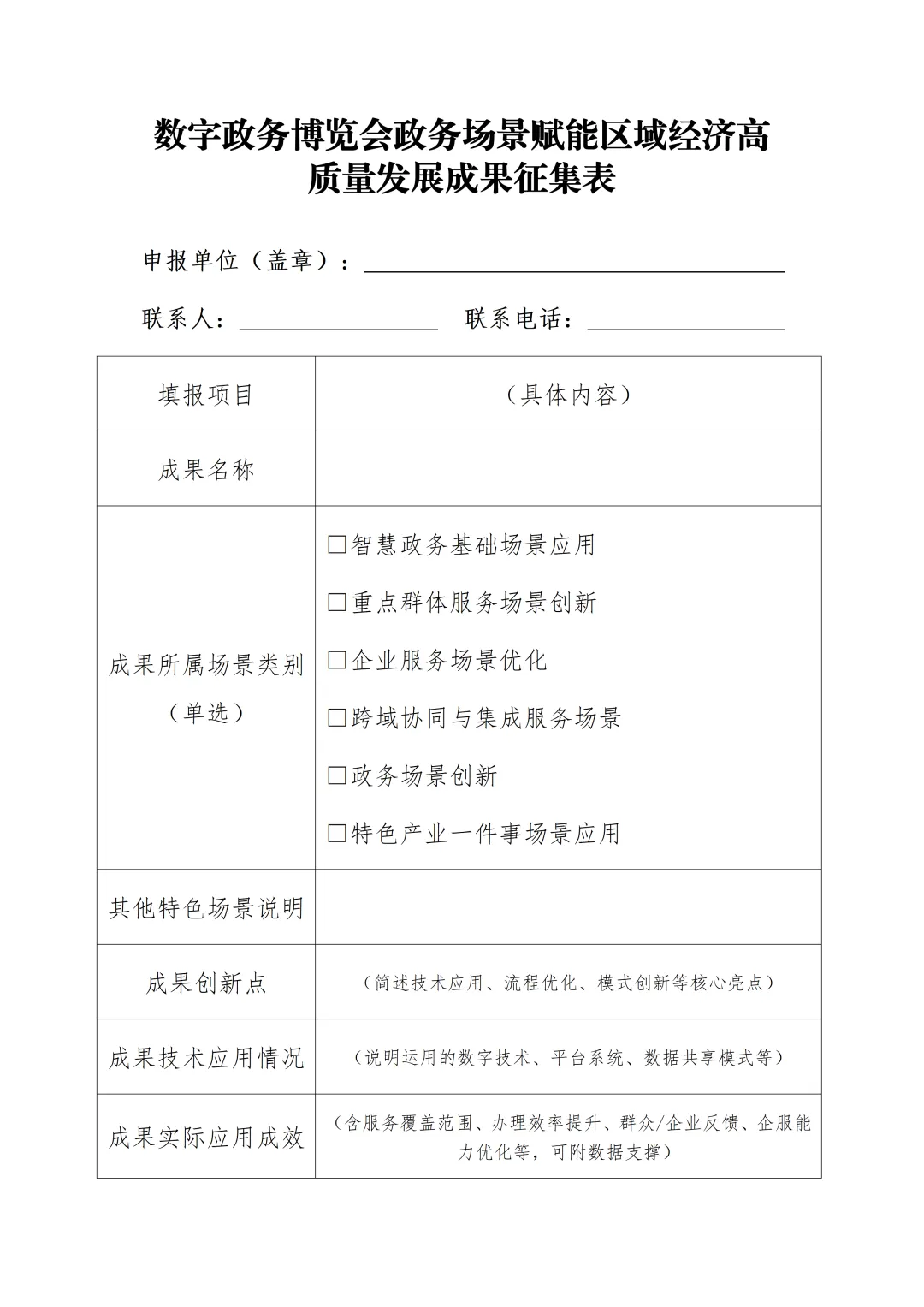 为深入推进数字政府建设,全面挖掘各单位在政务服务优化、社会治理创新、区域经济赋能、民生福祉提升等领域的创新实践,充分展现政务场景创新对提升治理效能、推动成果为民转化的重要作用,进一步总结可复制、可推广的经验做法,现面向各单位开展政务场景创新应用成果征集工作,具体说明如下:
