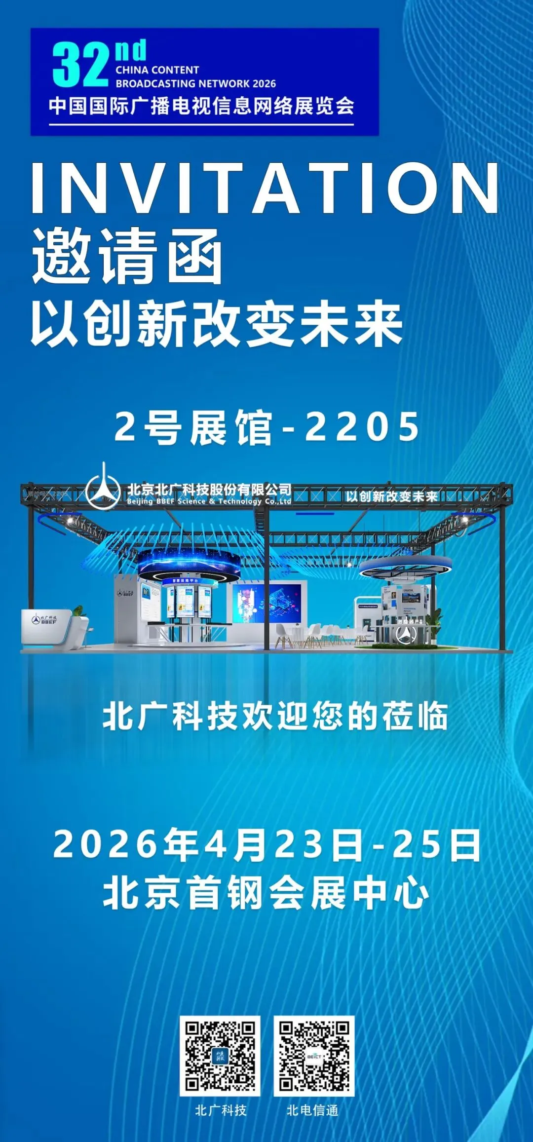 第三十二届中国国际广播电视信息网络展览会(CCBN2026)将于2026年4月23日至25日在北京首钢国际会展中心盛大启幕。北京电子信通科技有限责任公司(简称“北电信通”)旗下北京北广科技股份有限公司(简称“北广科技”),作为一家底蕴深厚的广电设备制造商,2026年将携全线产品矩阵及专业解决方案精彩亮相,与业界同仁共赴“数智创新 引领未来”之约,携手探索前沿趋势,合力开拓无限商机。