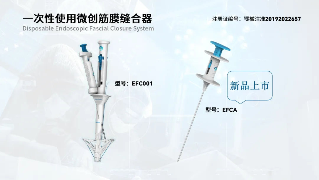 筋膜缝合器EFC001型号,独特屏蔽式防护翼及内置抓钩设计,能够安全且高效地实现3cm深度筋膜的紧密闭合,降低穿刺孔疝和裂开风险。