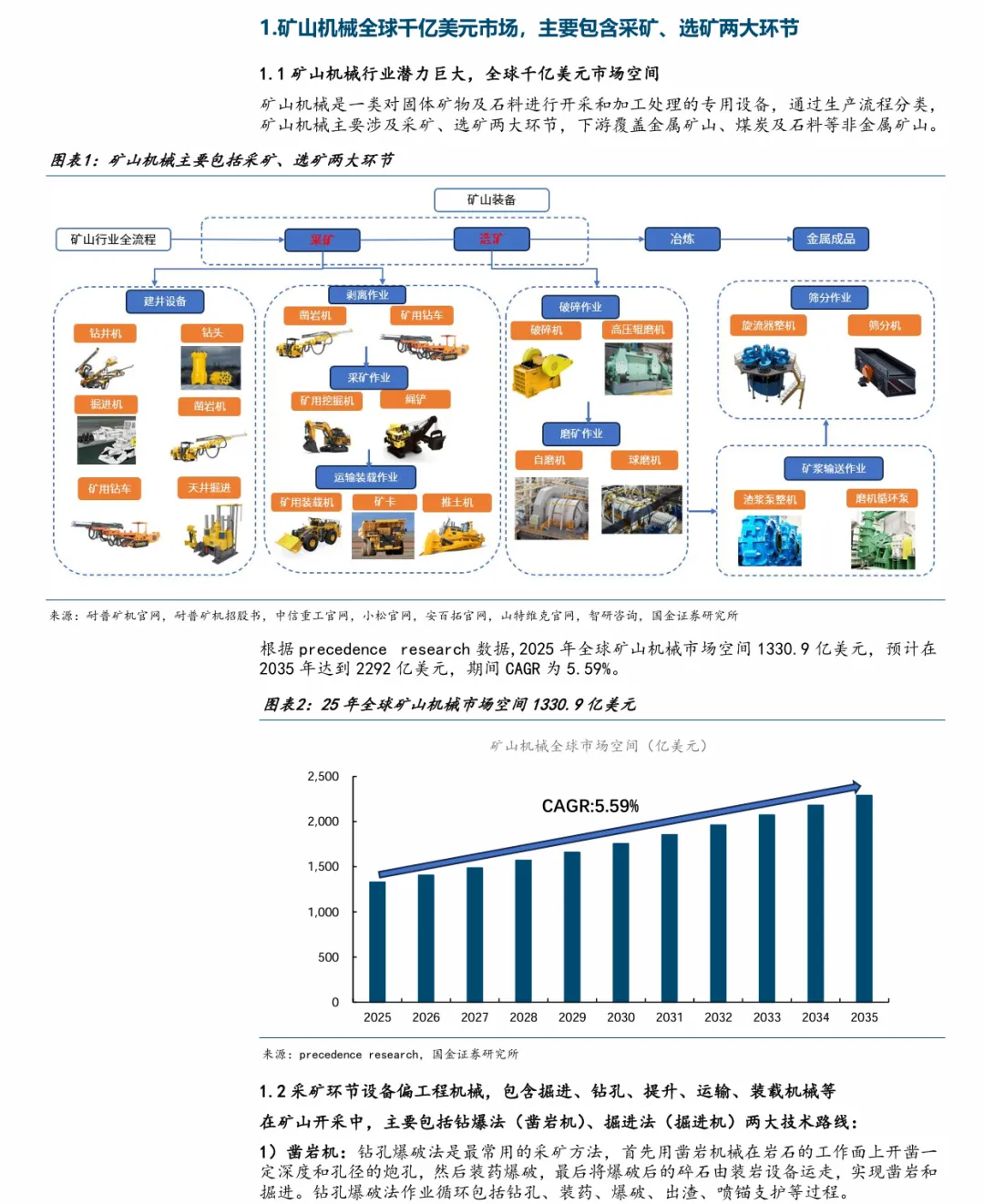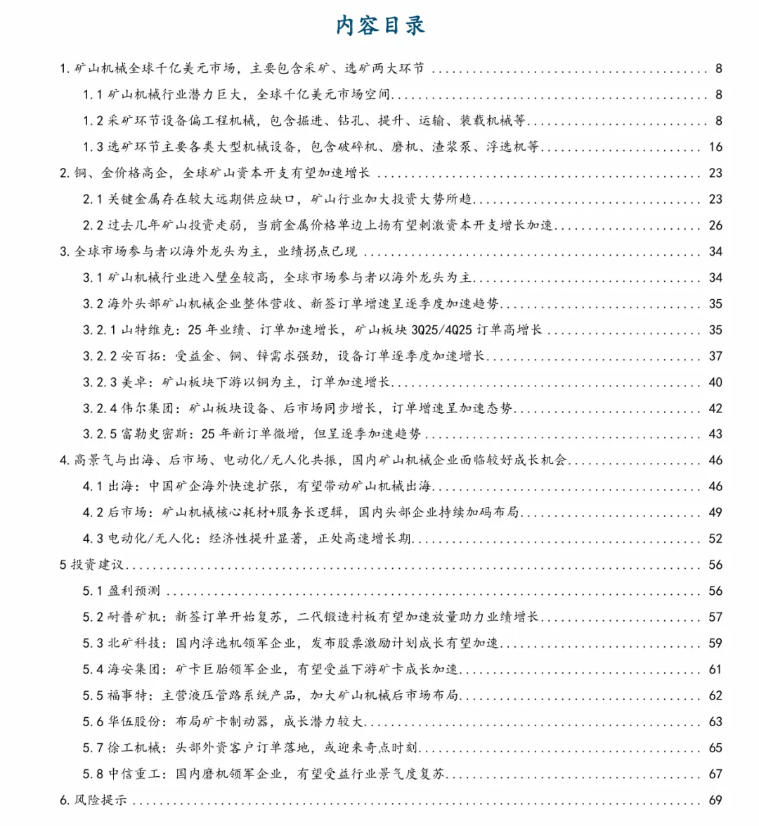 摘要:全球矿山机械市场规模超1330亿美元,铜、金价格高位推动矿企资本开支加速上行,行业景气拐点明确。国内企业迎来三重成长共振:出海随中国矿企全球化提速,出口高增且毛利更优;后市场空间广阔,耗材与服务成稳定现金流;电动化、无人化降本显著,矿区无人驾驶市场2030年有望达301亿元。海外龙头订单高增验证复苏,国内耐普矿机、徐工机械、中信重工等充分受益,行业配置价值凸显。