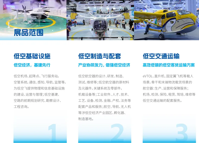 国际低空展关注低空企业发展需求,通过主题展览、专业论坛、演示体验和对接活动等丰富的内容和形式,推动产业发展、拓展应用场景、促进生态融合。为低空经济管理、研究、生产、服务与应用等领域的展商和观众,打造展示交流平台。