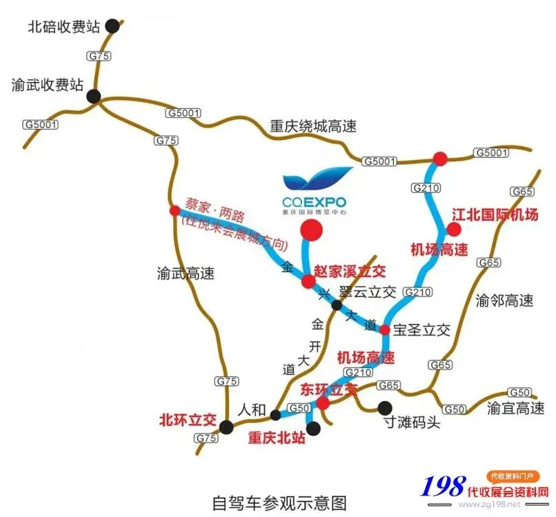 G50(沪渝高速)、G65(包茂高速)、G75(兰海高速)、G85(渝昆高速)、G93(成渝环线高速)等各条高速公路 → 重庆内环快速路 → 东环立交 → 机场高速 → 宝圣立交 → 金兴大道 → 赵家溪立交 → 金兴大道 → 国博中心,国博中心备有免费停车场,欢迎自驾参观展会。