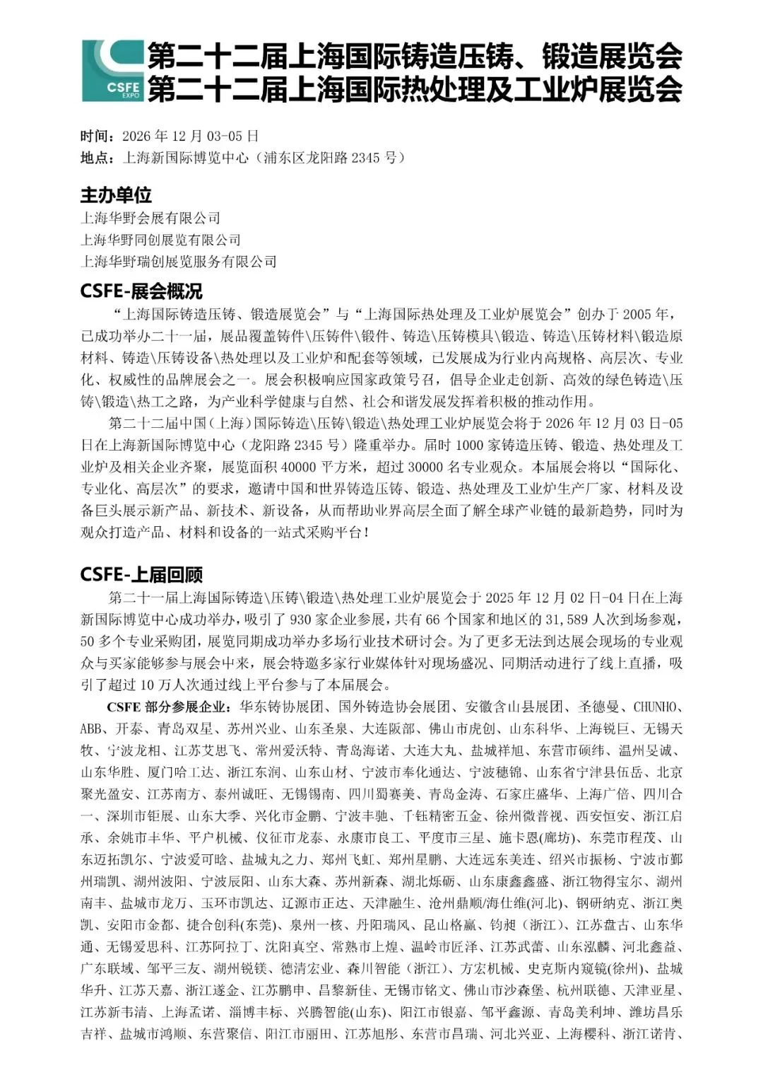 需要参展的企业可以先点击连接2026第二十二届上海国际铸造压铸、锻造及热处理工业炉展览会展位申请表,等展位确定好后直接将参展申请表打印出来填写好盖章回传到主办单位,主办单位收到申请表后也会尽快上报公司帮您把展位确定下来,谢谢!