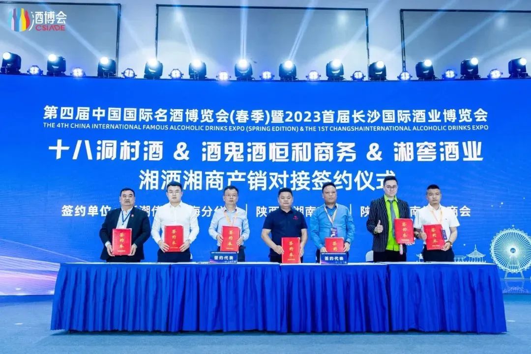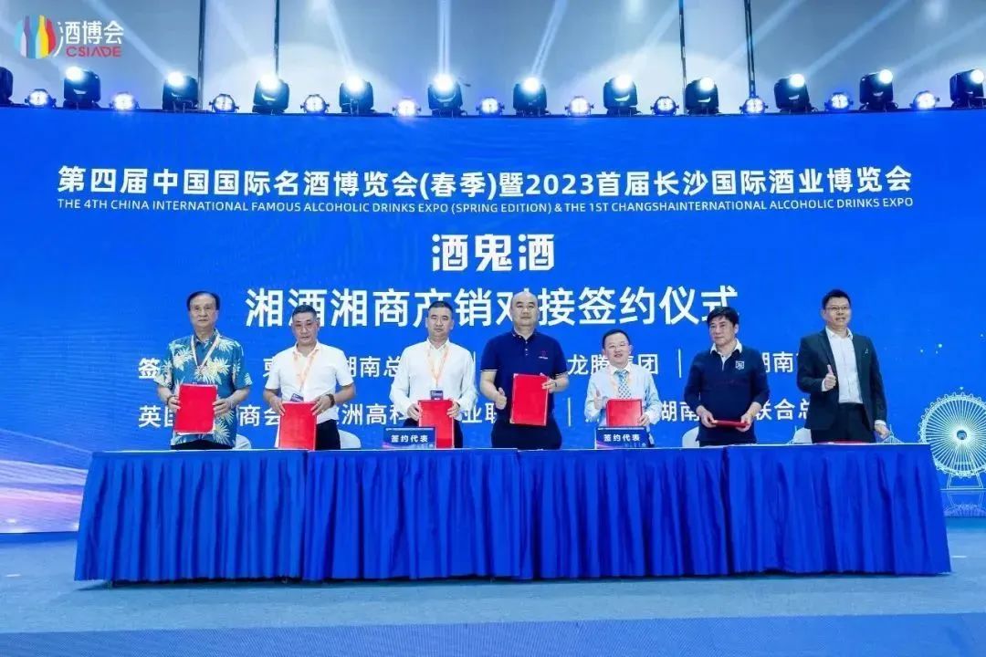 酒博会上策划举办的“酒鬼酒·湘酒高质量发展高峰论坛”、”湘商回湘助力湘酒振兴”主题晚宴、湘酒湘窖“敢为天下香”湖湘夜宴等活动,深掘湘酒历史底蕴,科学分析了酒业市场新形态,面对市场挑战、赋能新趋势,引导酒类产业升级。共50家企业单位,分别与酒鬼酒、湘窖酒业、武陵酒业、浏阳河厂、白沙液酒等酒企签约9.89亿,与柬埔寨、老挝、英国、欧洲、加拿大等境外湖南商协会达成推广战略合作协议,大力助推湘酒走出国门。