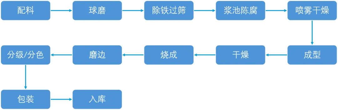 粉料制备:经过配料、球磨、除铁过筛、泥浆均化、喷雾干燥制粉等步骤,完成了瓷片在生产的粉料制备环节。