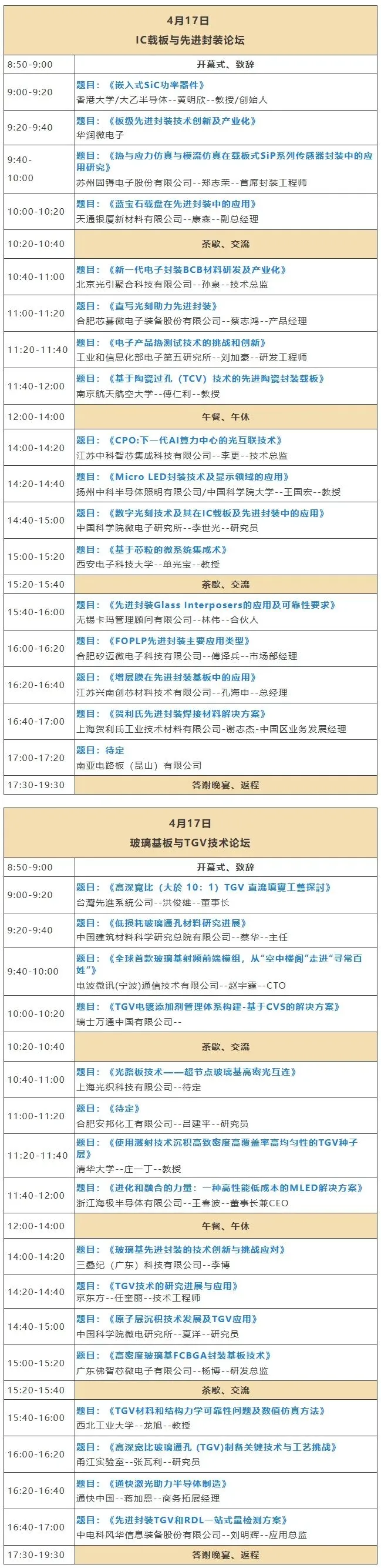 根据最新议程,本次大会分为“IC载板与先进封装论坛”及“玻璃基板与TGV技术论坛”两大平行会场。
